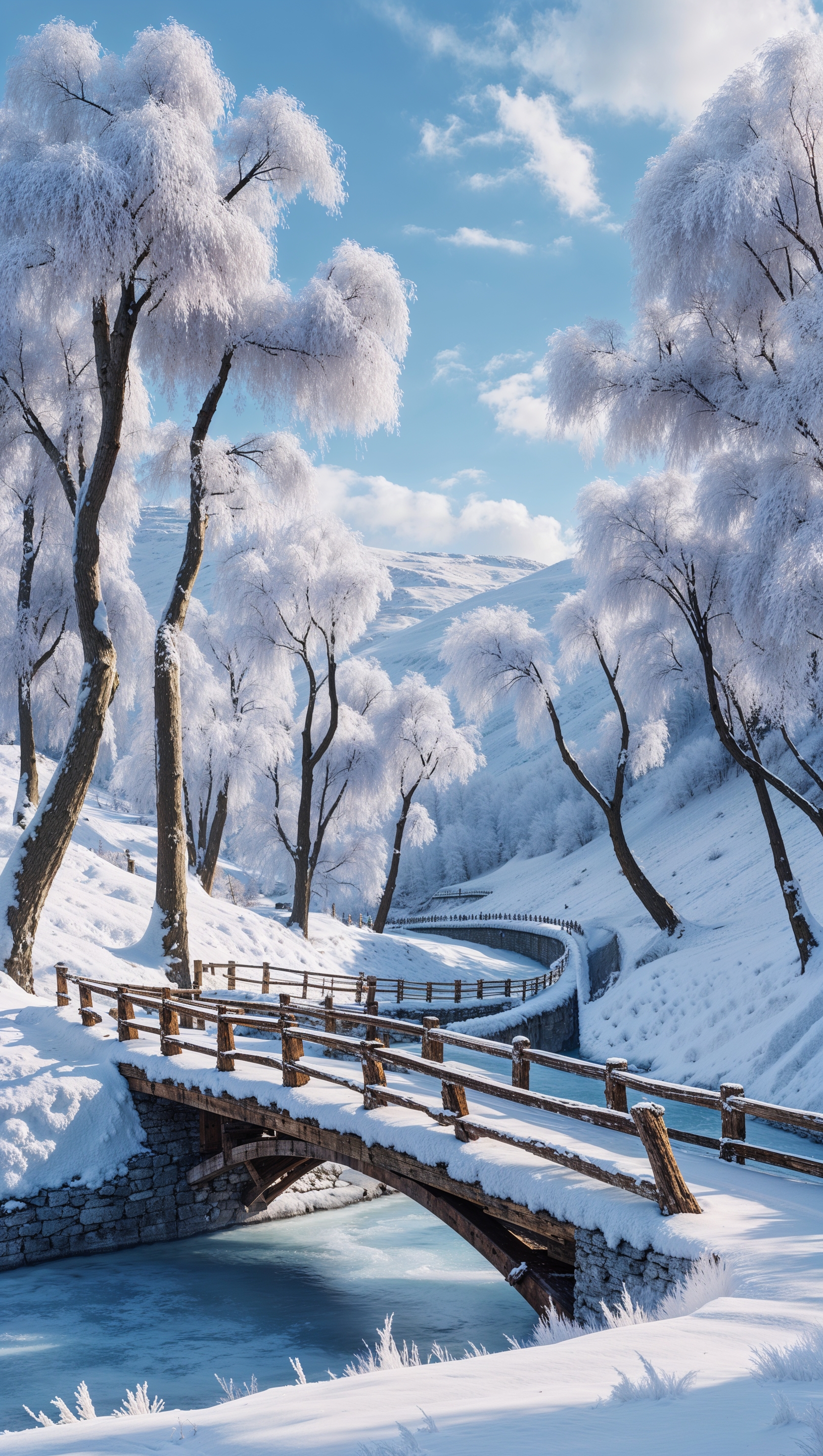 1664x2944 Bridge over frozen river surrounded by snow-laden branches