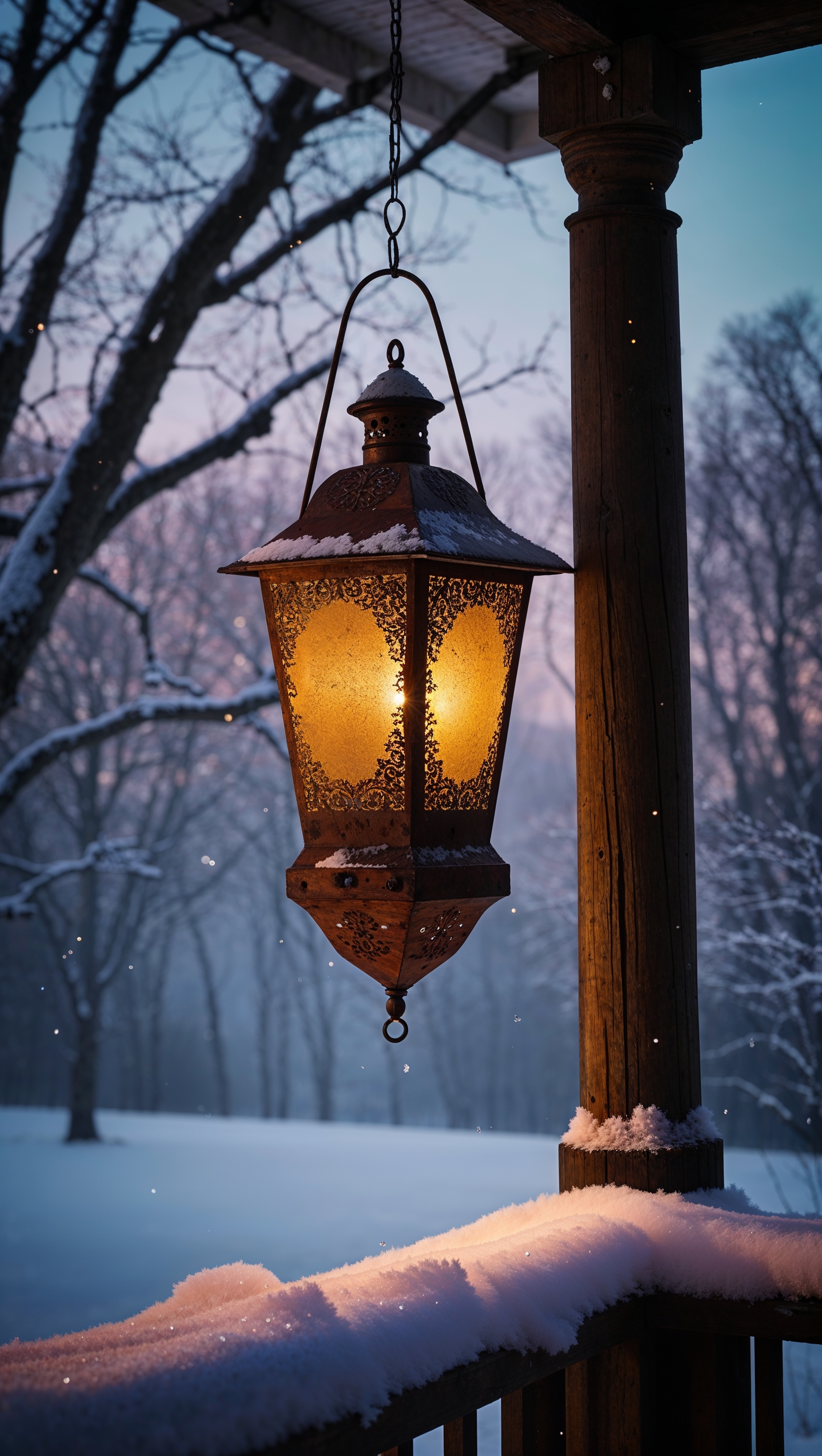 1664x2944 Old lantern hanging on snowy porch glowing in dusk