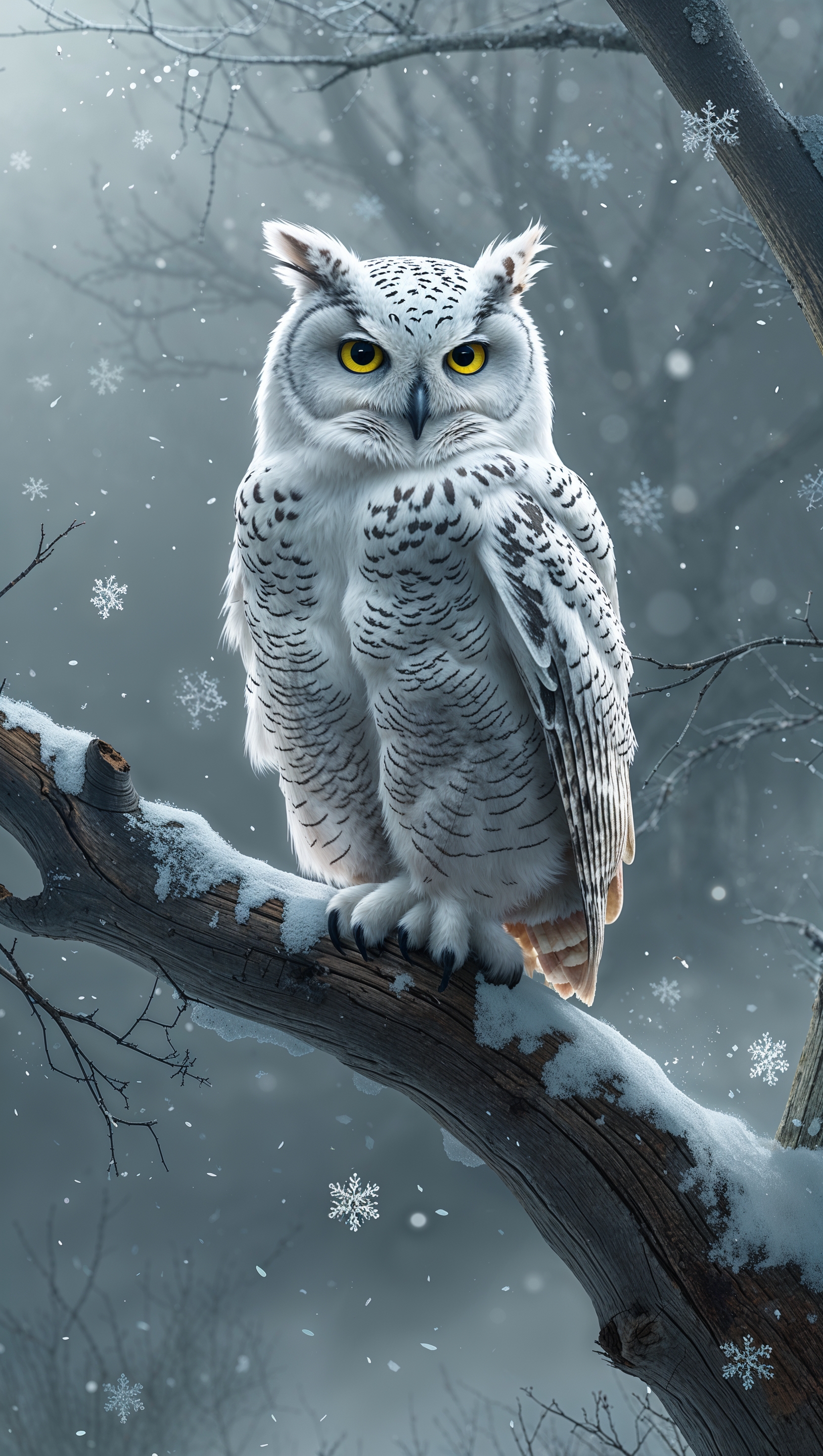 1664x2944 Snowy owl perched on tree branch surrounded by falling snow