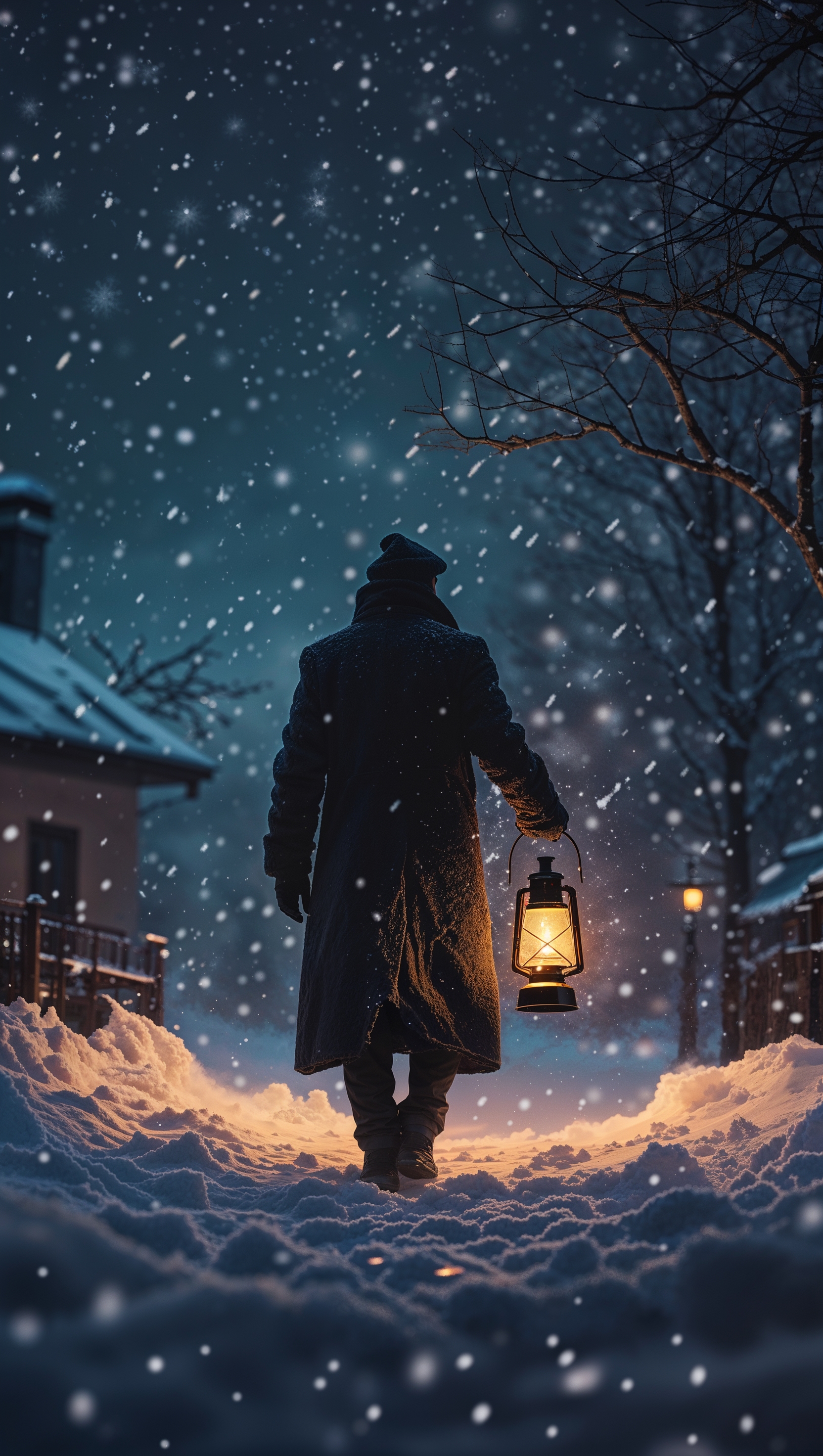 1664x2944 Silhouette of a person walking through snowfall at night with lantern