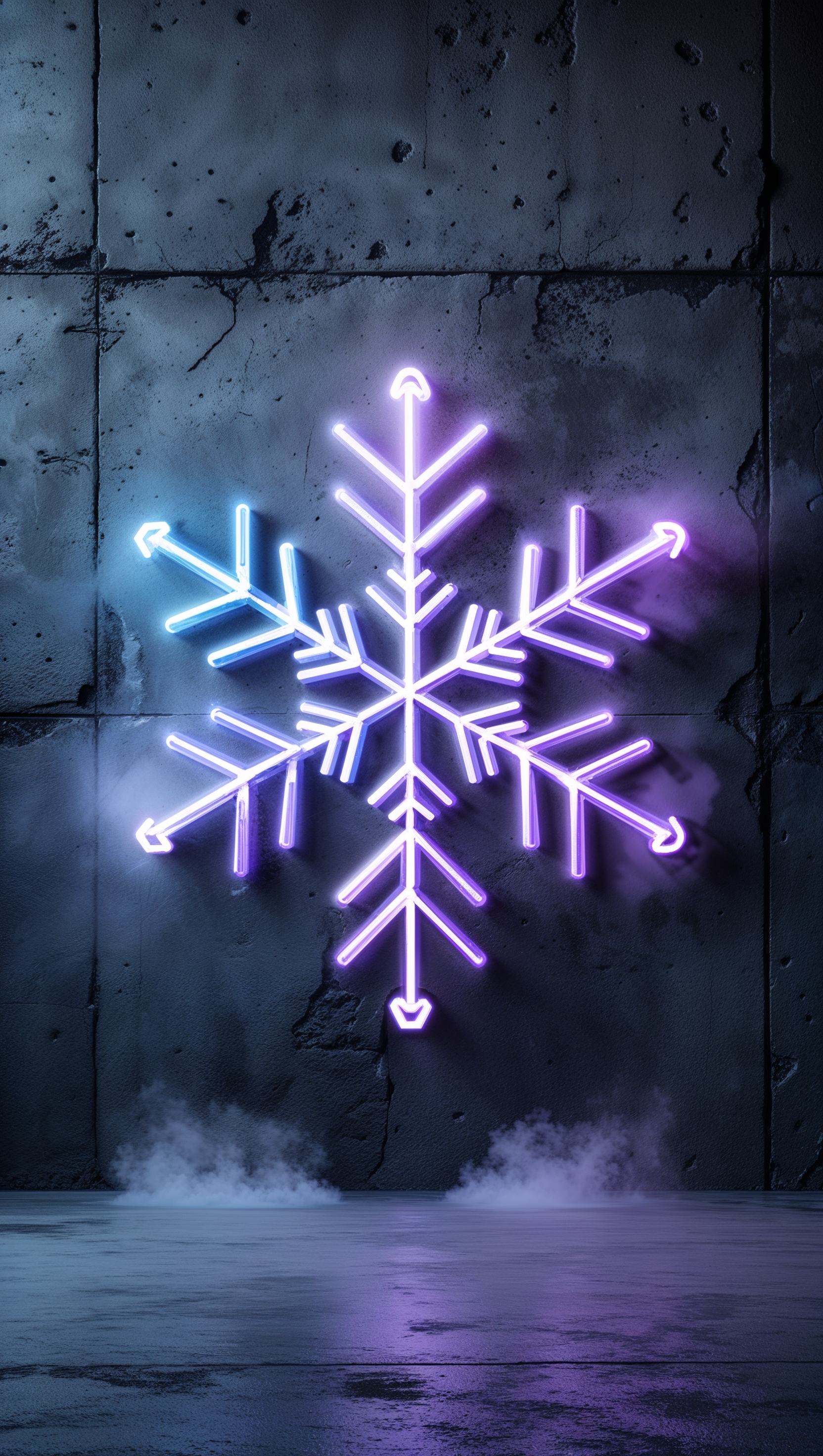 1664x2944 Neon snowflake icon glowing on dark concrete wall, cyber winter feel