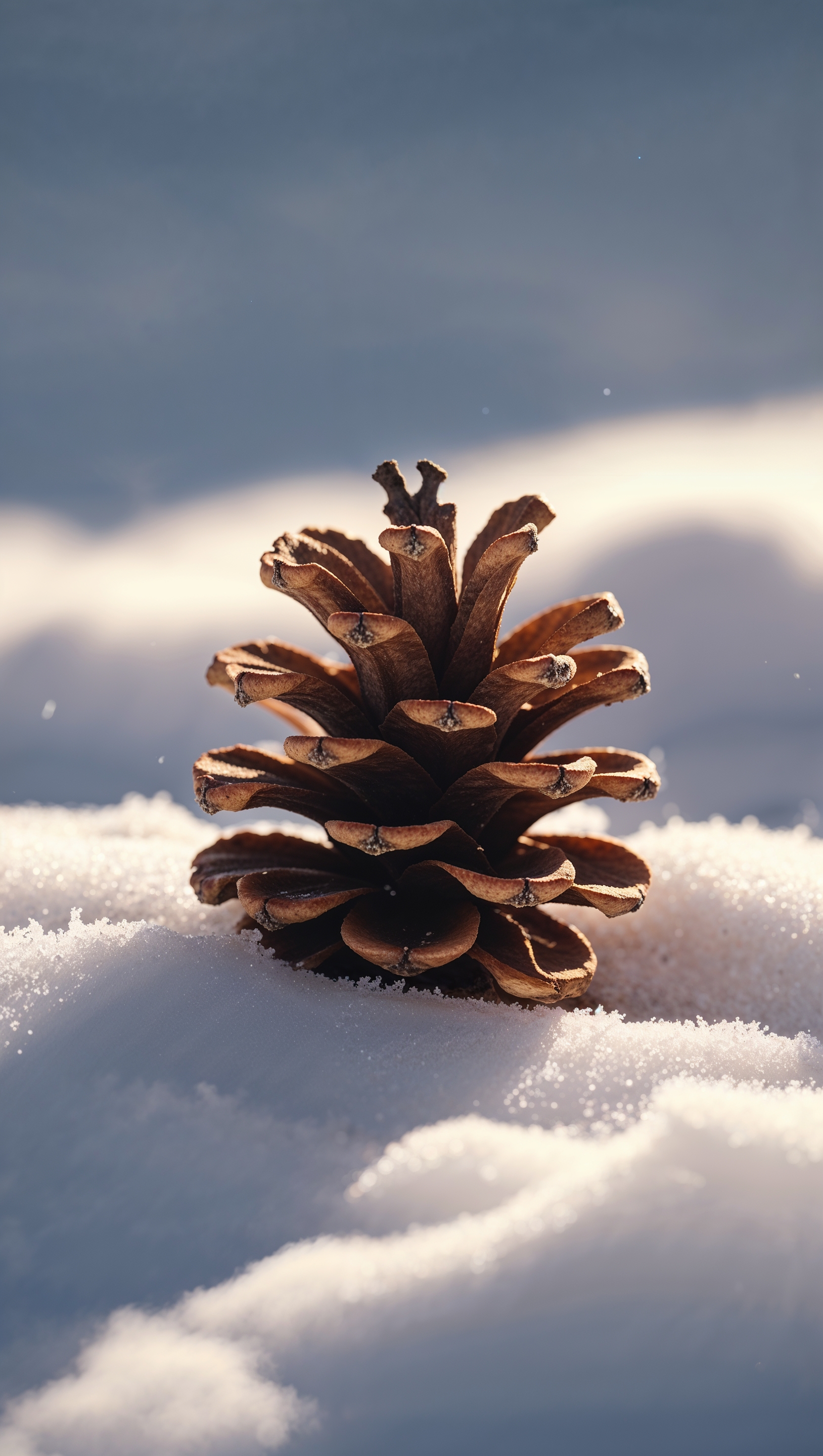1664x2944 A single pine cone resting on snow with soft top-down light