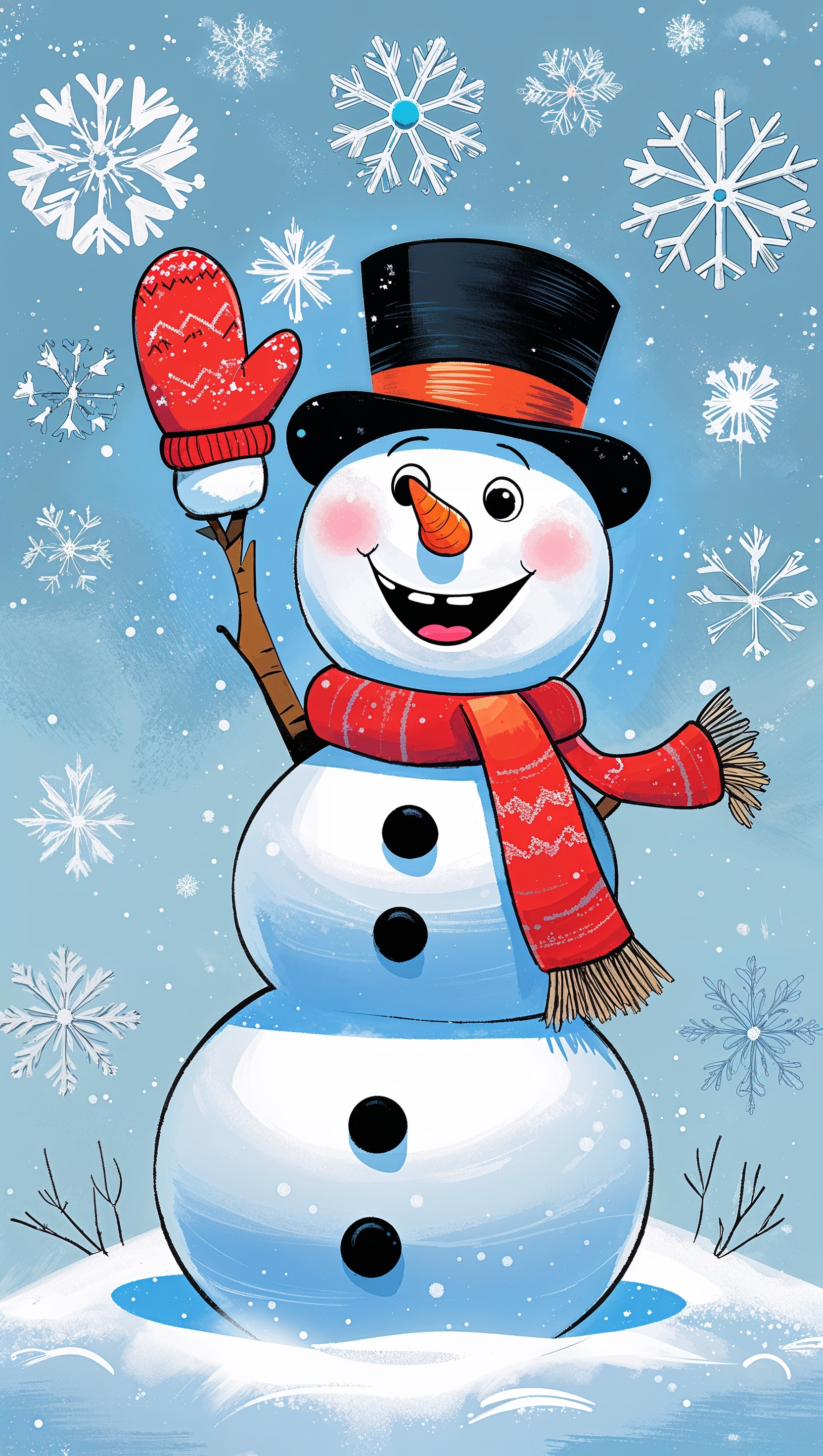 1664x2944 Cute cartoon snowman waving on light blue background with snowflakes