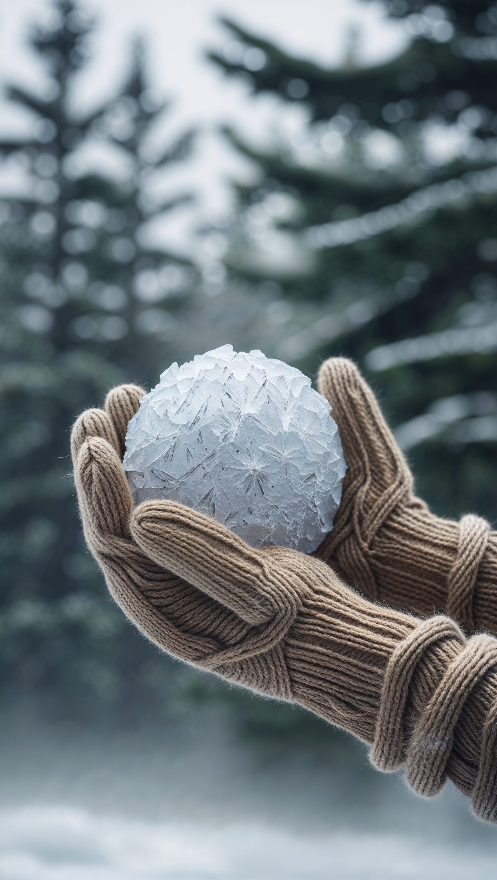 1664x2944 Warm mittens holding snowball with blurred pine trees in background