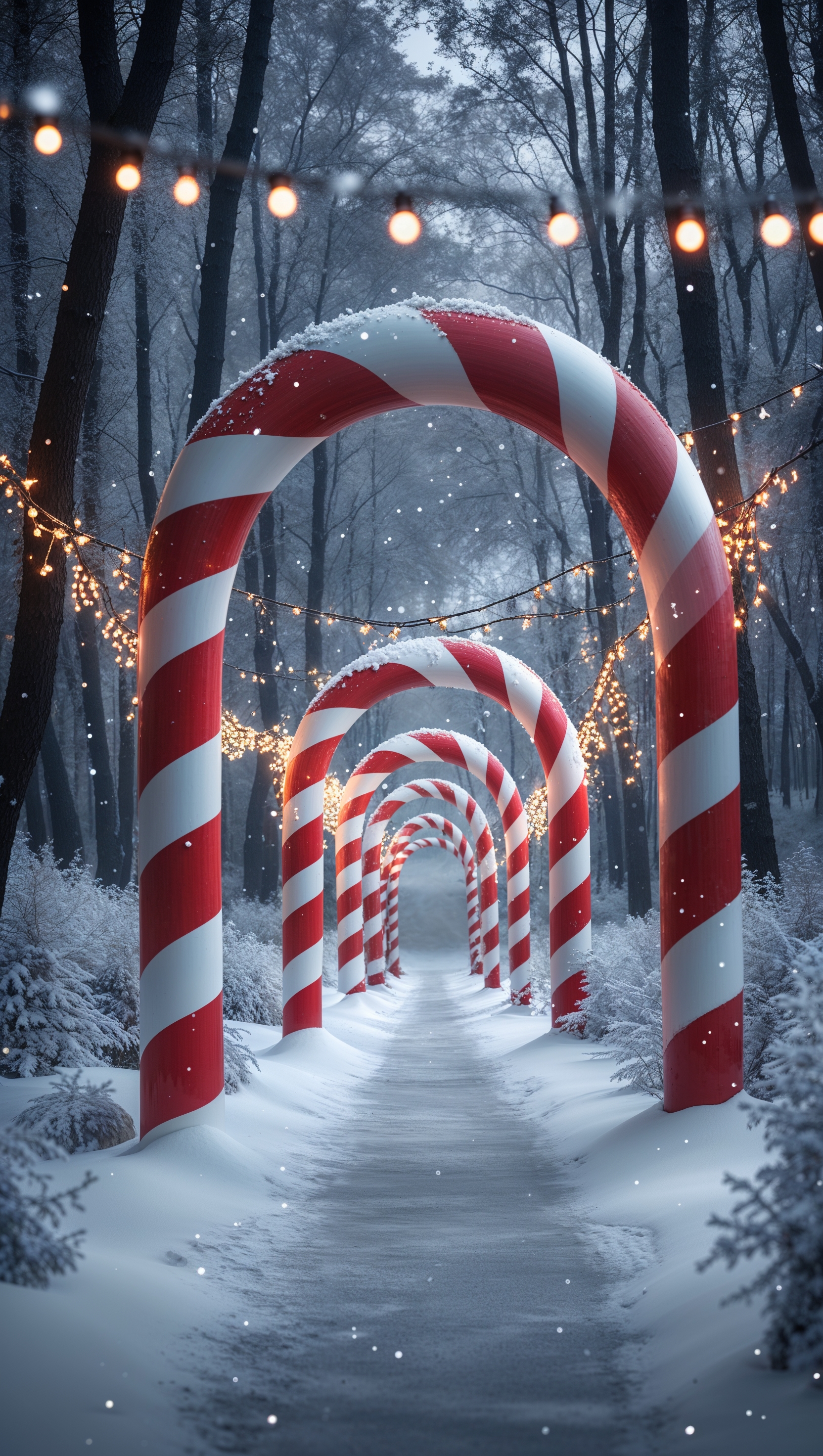 1664x2944 Vertical snowy path lined with candy canes and fairy lights, festive vibe