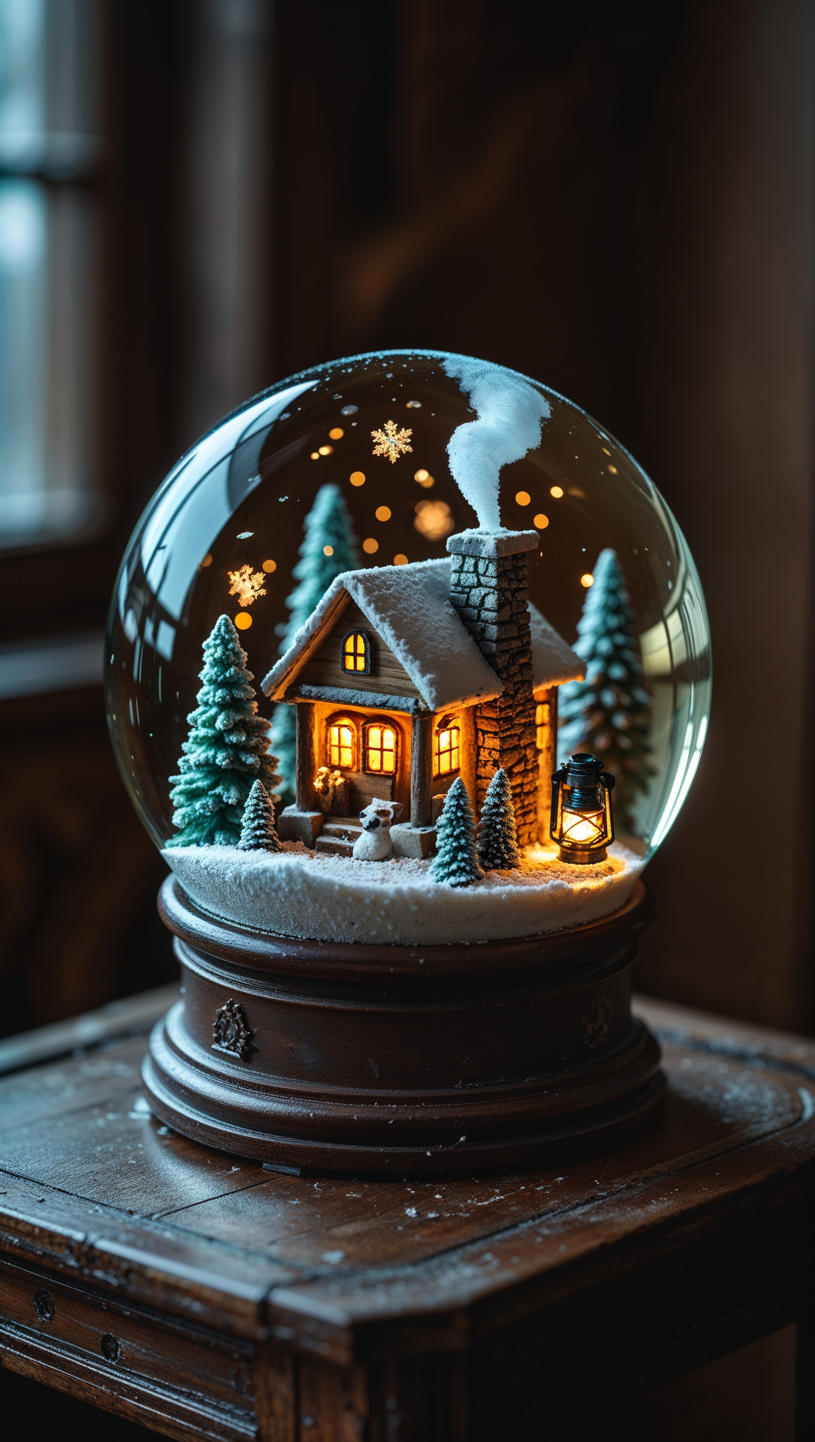 1664x2944 Snow globe with cozy cabin scene inside, glowing warmly in dark room