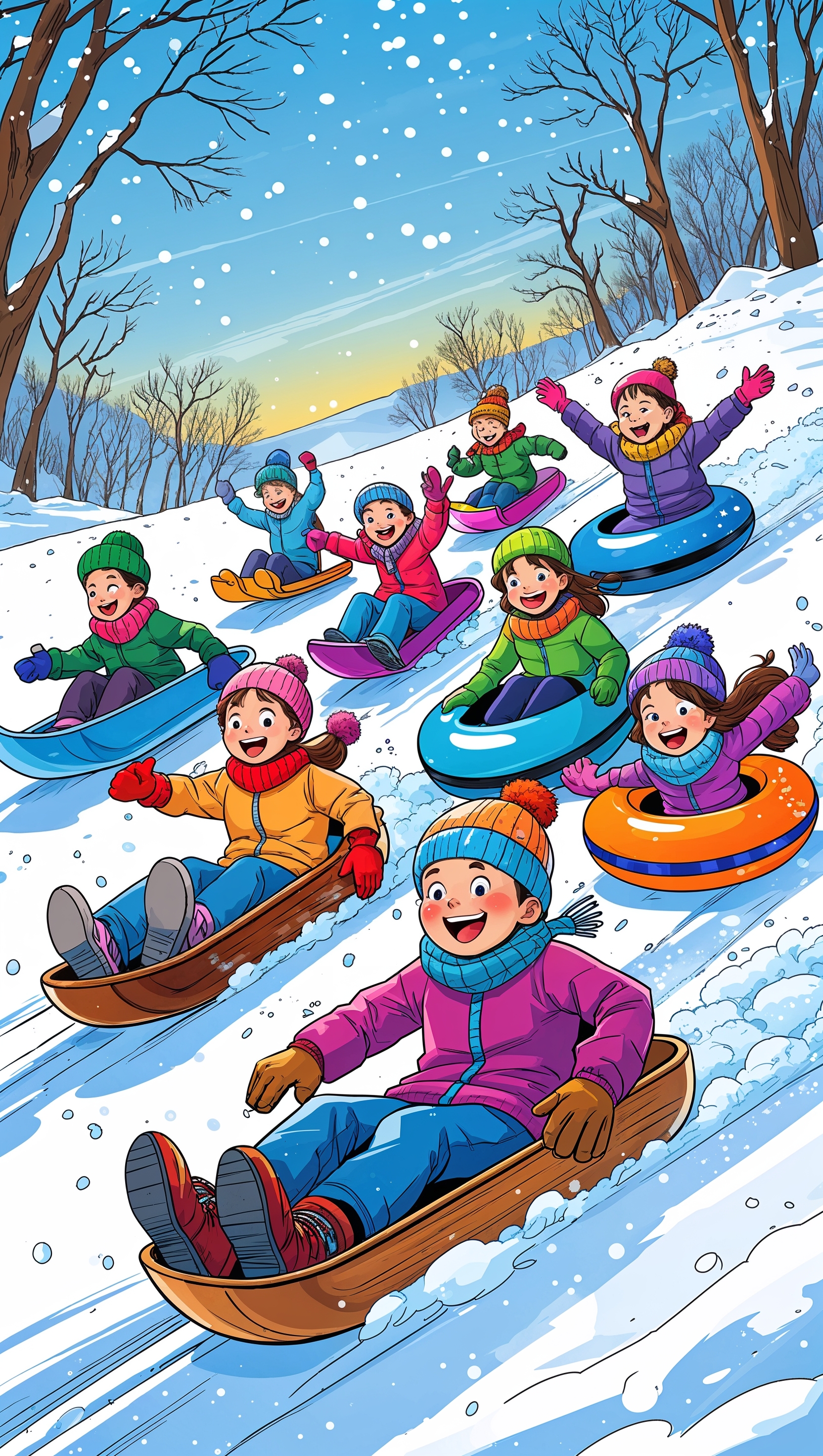 1664x2944 Vertical comic-style scene of kids sledding on snow hill