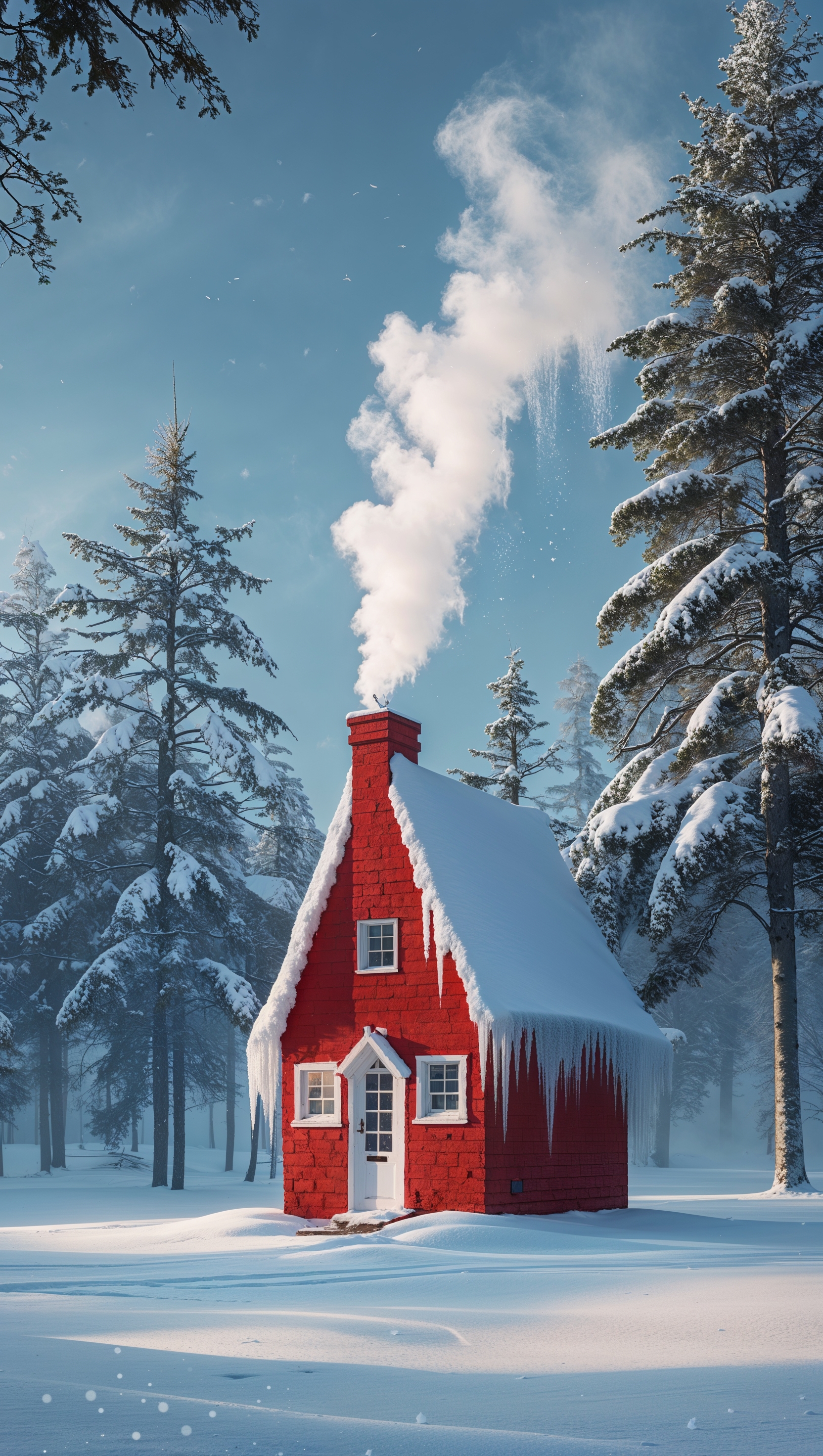 1664x2944 Little red house surrounded by snow with warm chimney smoke