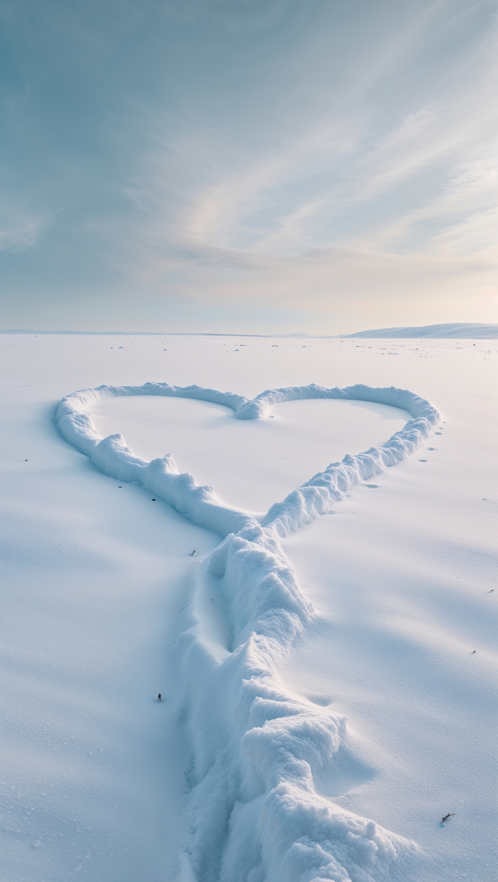 1664x2944 Snow trail forming a heart shape in untouched white field