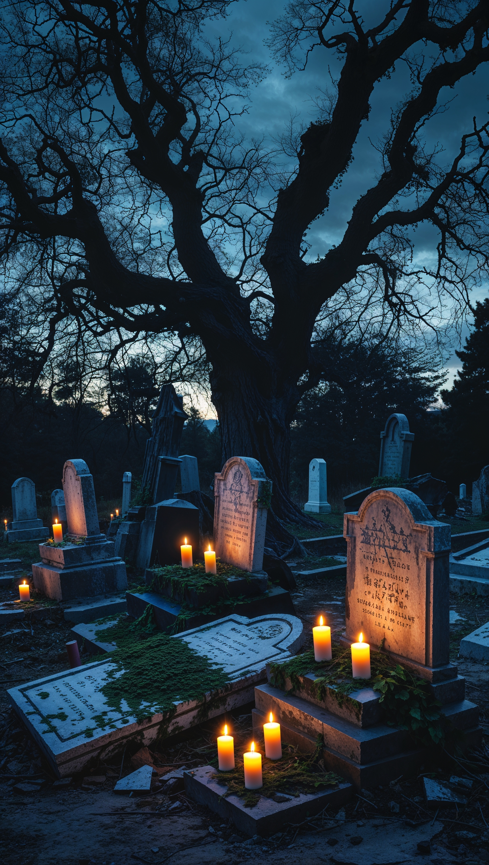1664x2944 Abandoned graveyard at dusk with broken tombstones and flickering candles