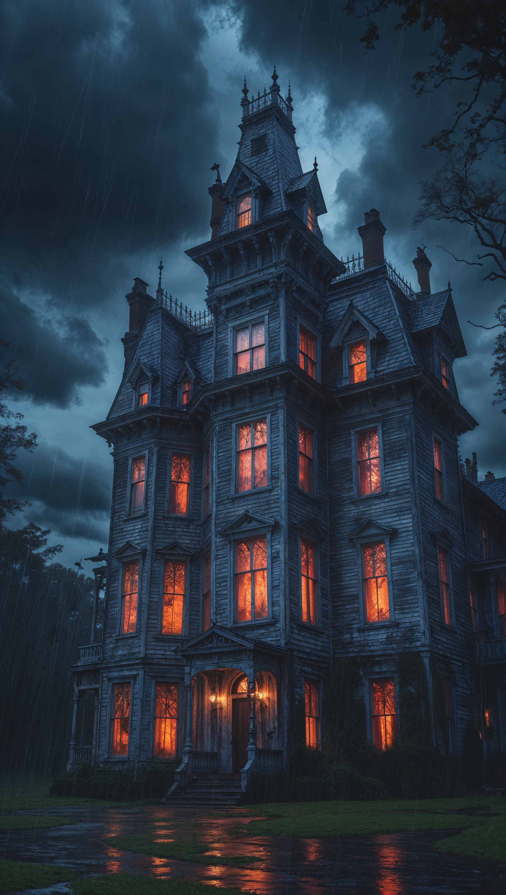1664x2944 Haunted Victorian house with glowing windows under stormy Halloween night