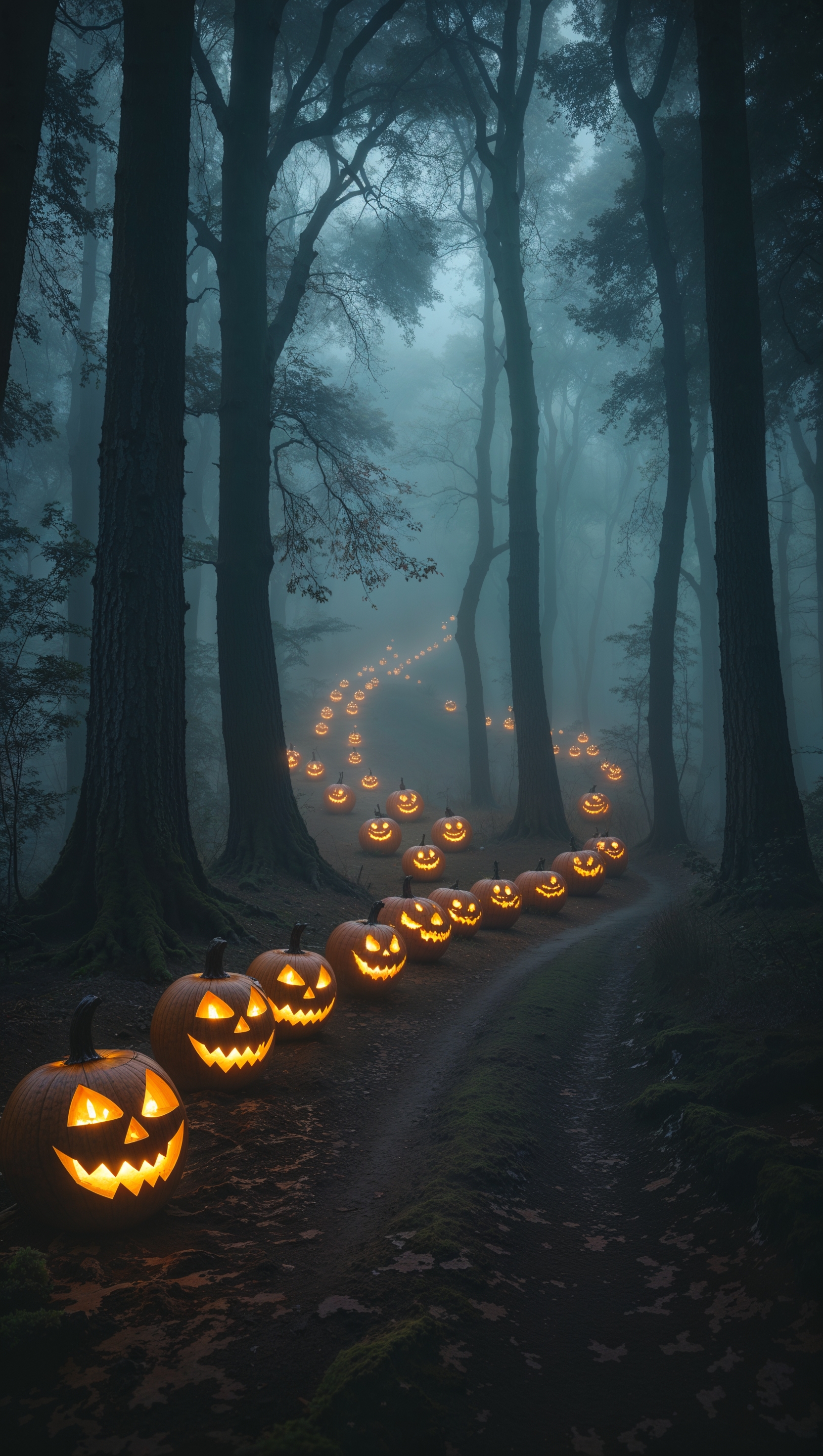 1664x2944 Cinematic foggy forest path lit by carved jack-o'-lanterns, spooky atmosphere