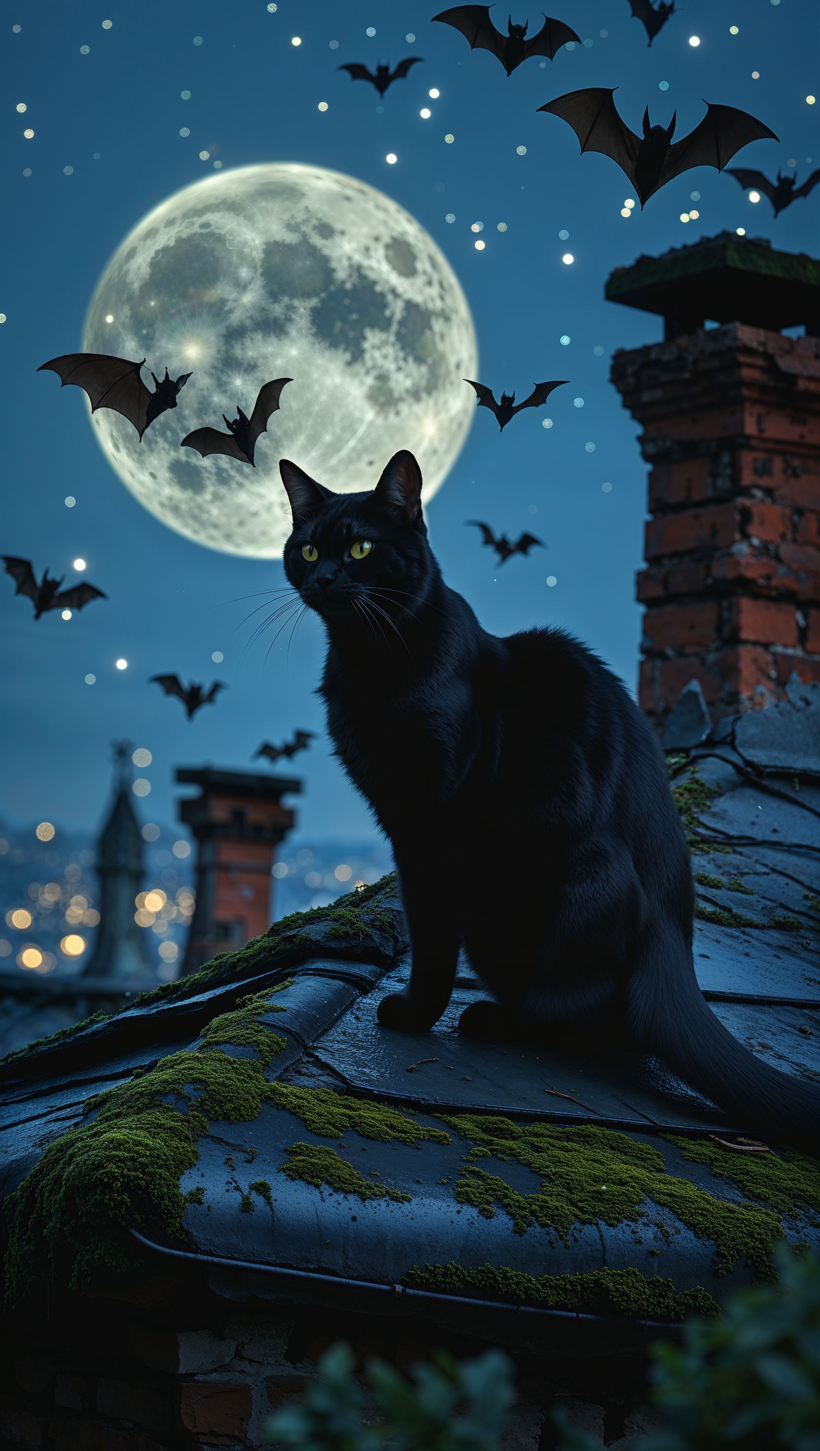 1664x2944 Silhouette of a black cat on a rooftop under full moon with flying bats