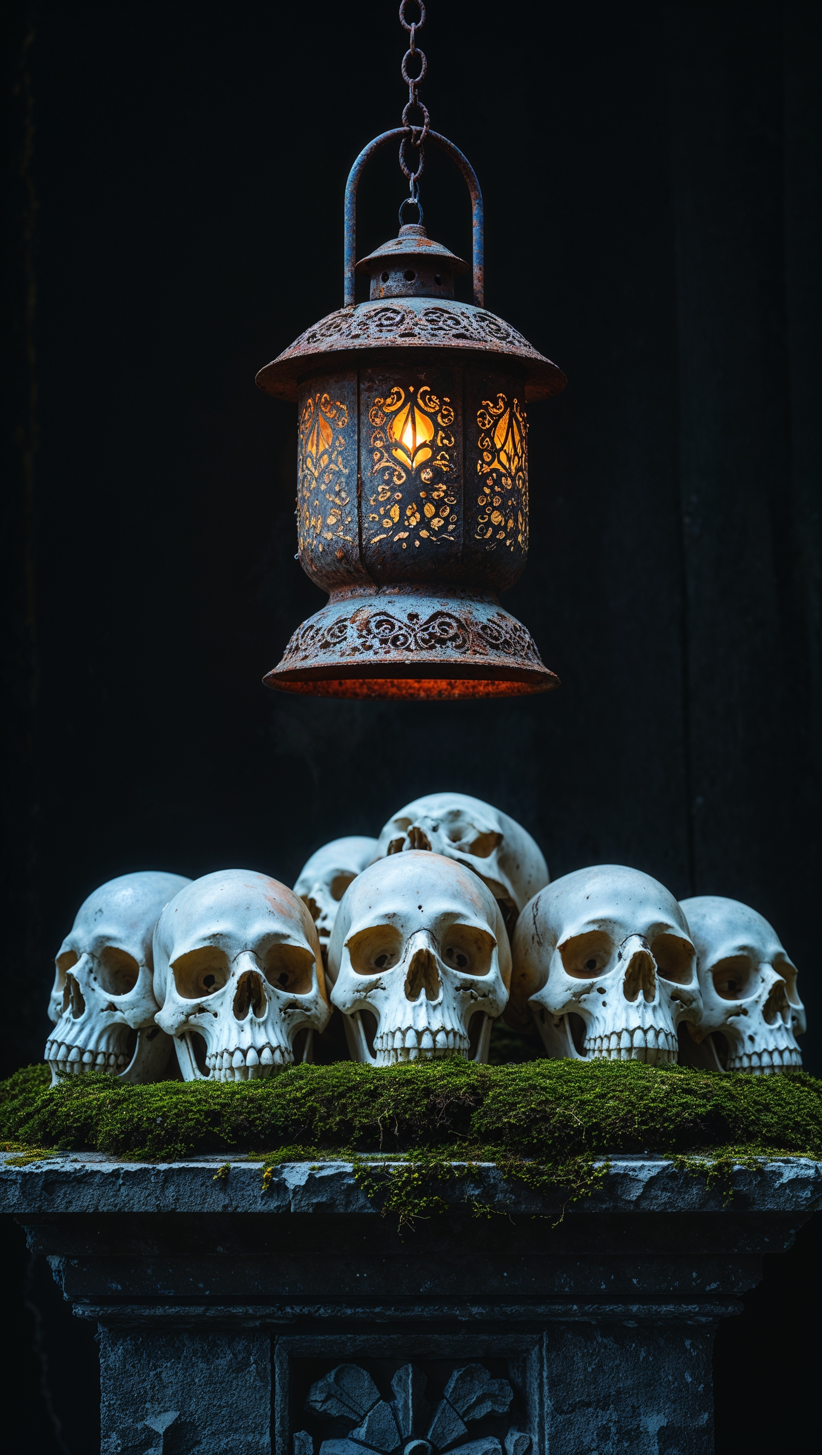 1664x2944 Old lantern swinging on a chain, lighting up carved skulls in the dark
