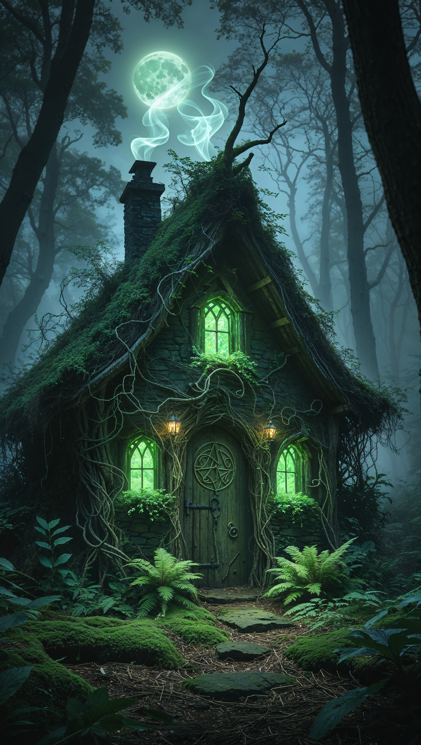 1664x2944 Witch’s cottage in the woods with glowing green lights and smoke rising