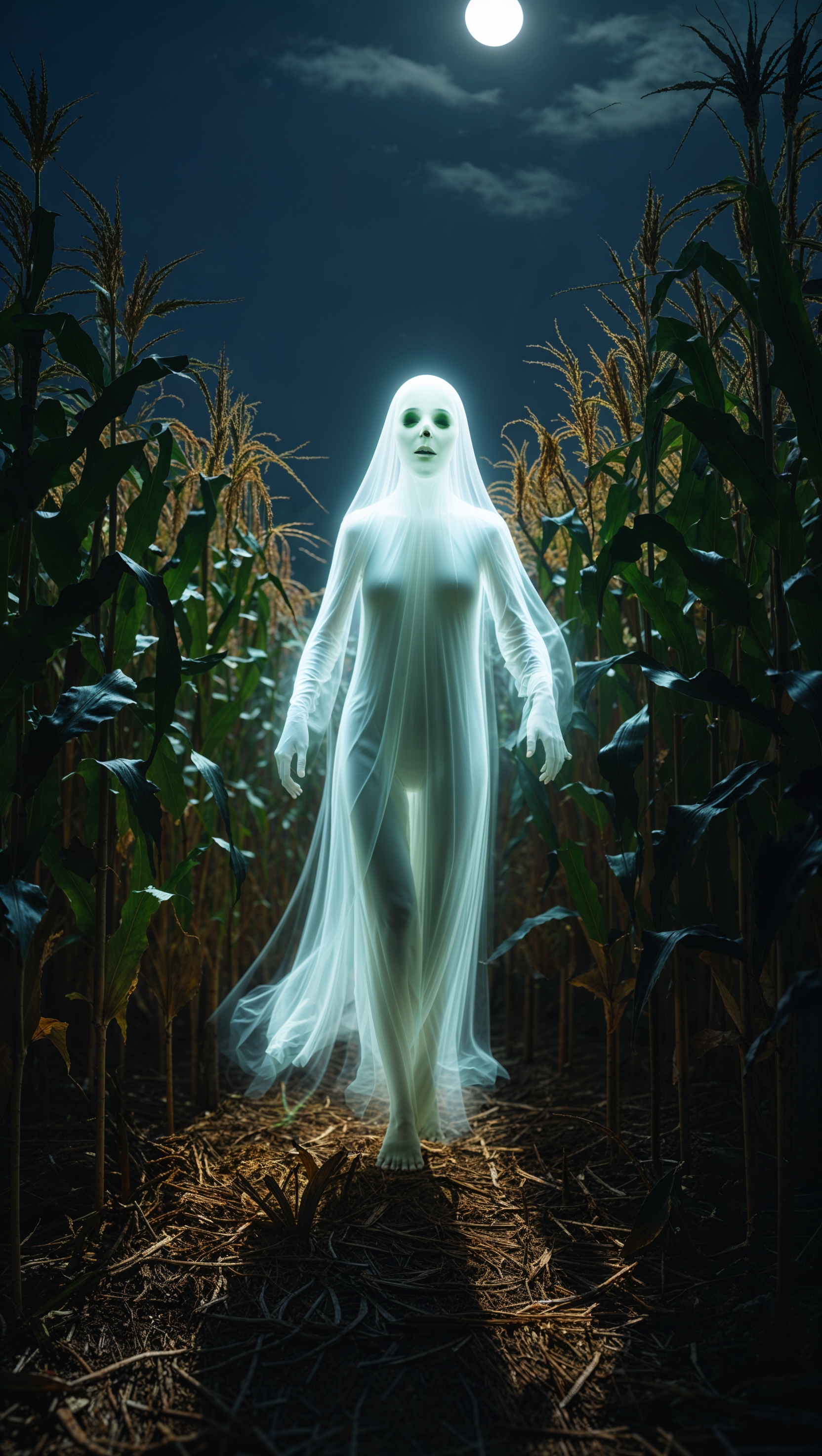 1664x2944 Glowing ghost figure walking through a cornfield at night, cinematic contrast