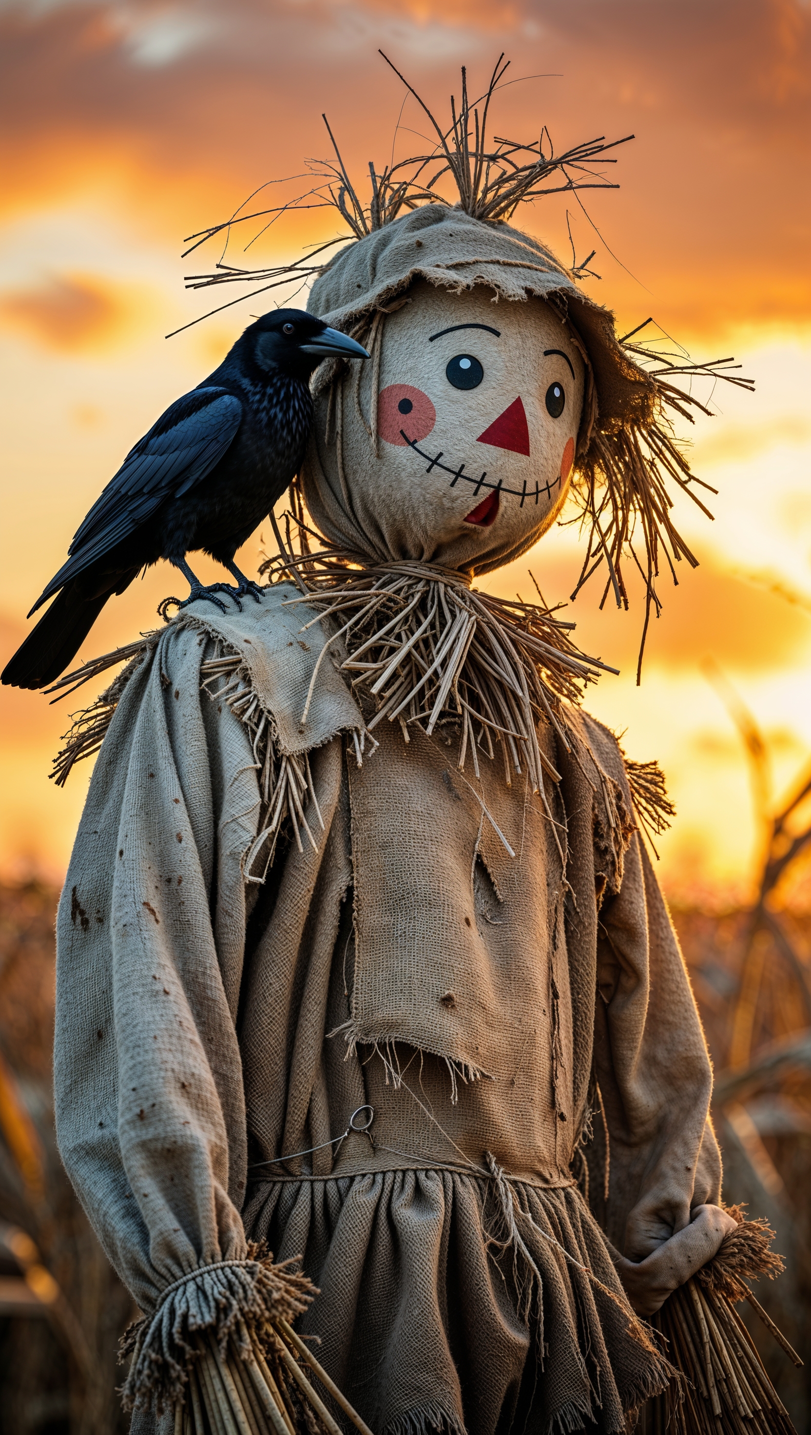1664x2944 Scarecrow with torn clothes and crow on shoulder, backlit by orange sky
