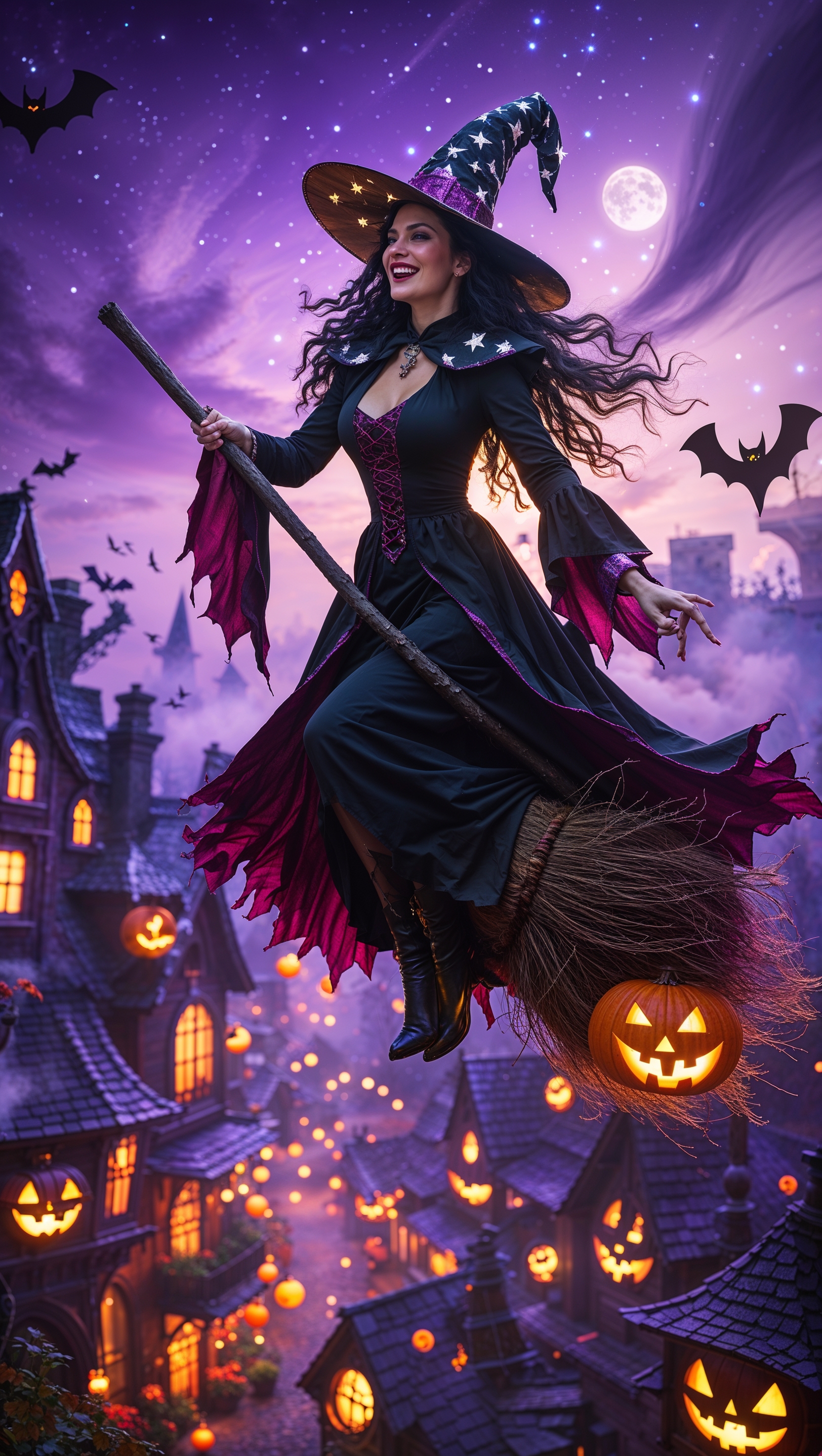 1664x2944 Witch flying on broomstick over glowing Halloween town, purple sky