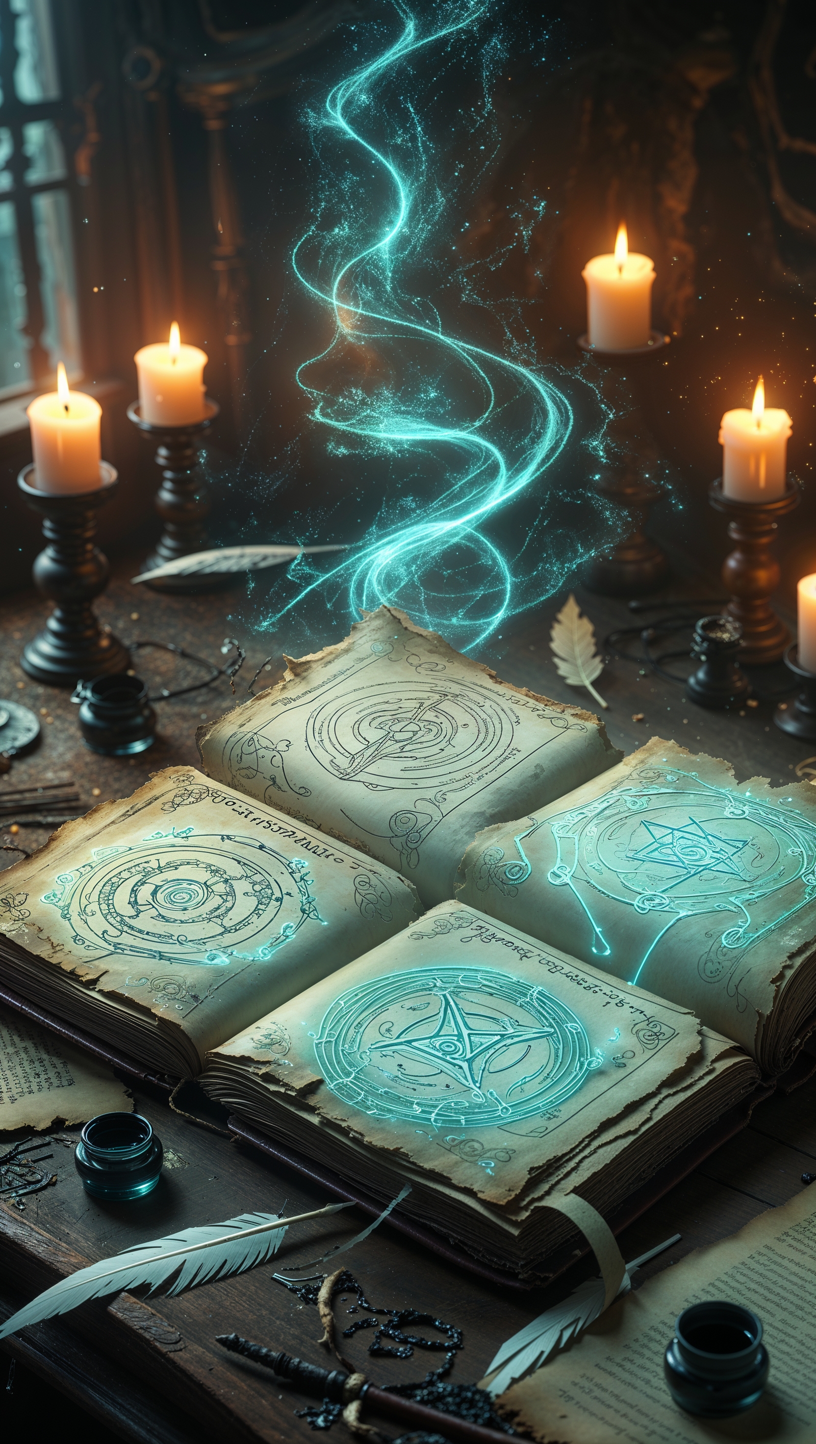 1664x2944 Spellbook open on candle-lit desk with flying pages and glowing symbols