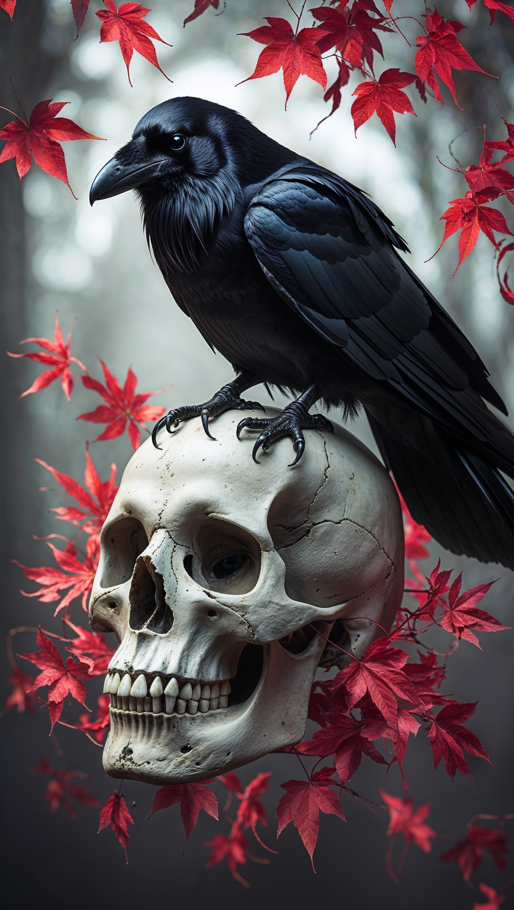 1664x2944 Black raven perched on skull surrounded by floating red leaves