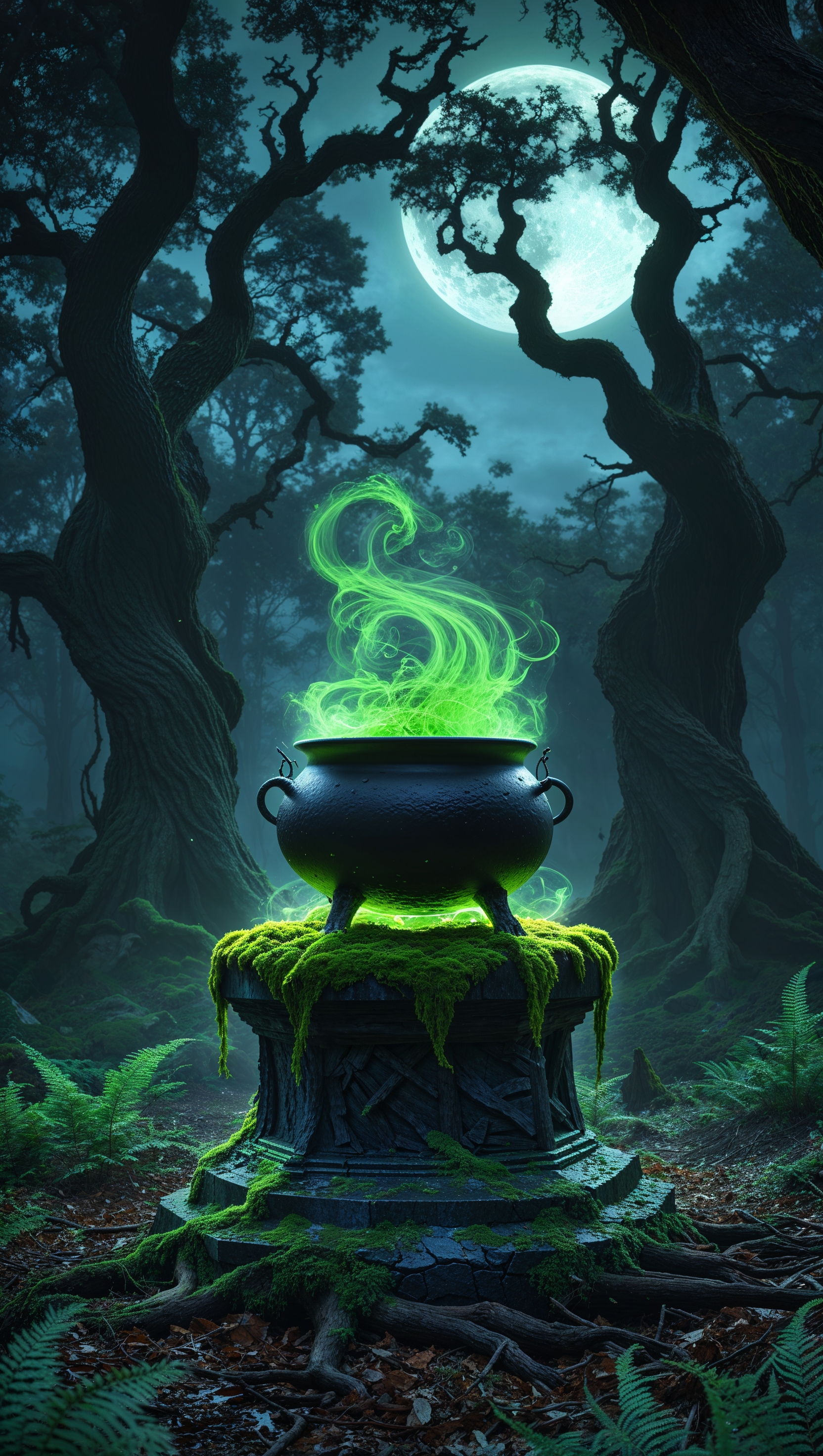1664x2944 Cauldron bubbling with neon green liquid in dark forest clearing