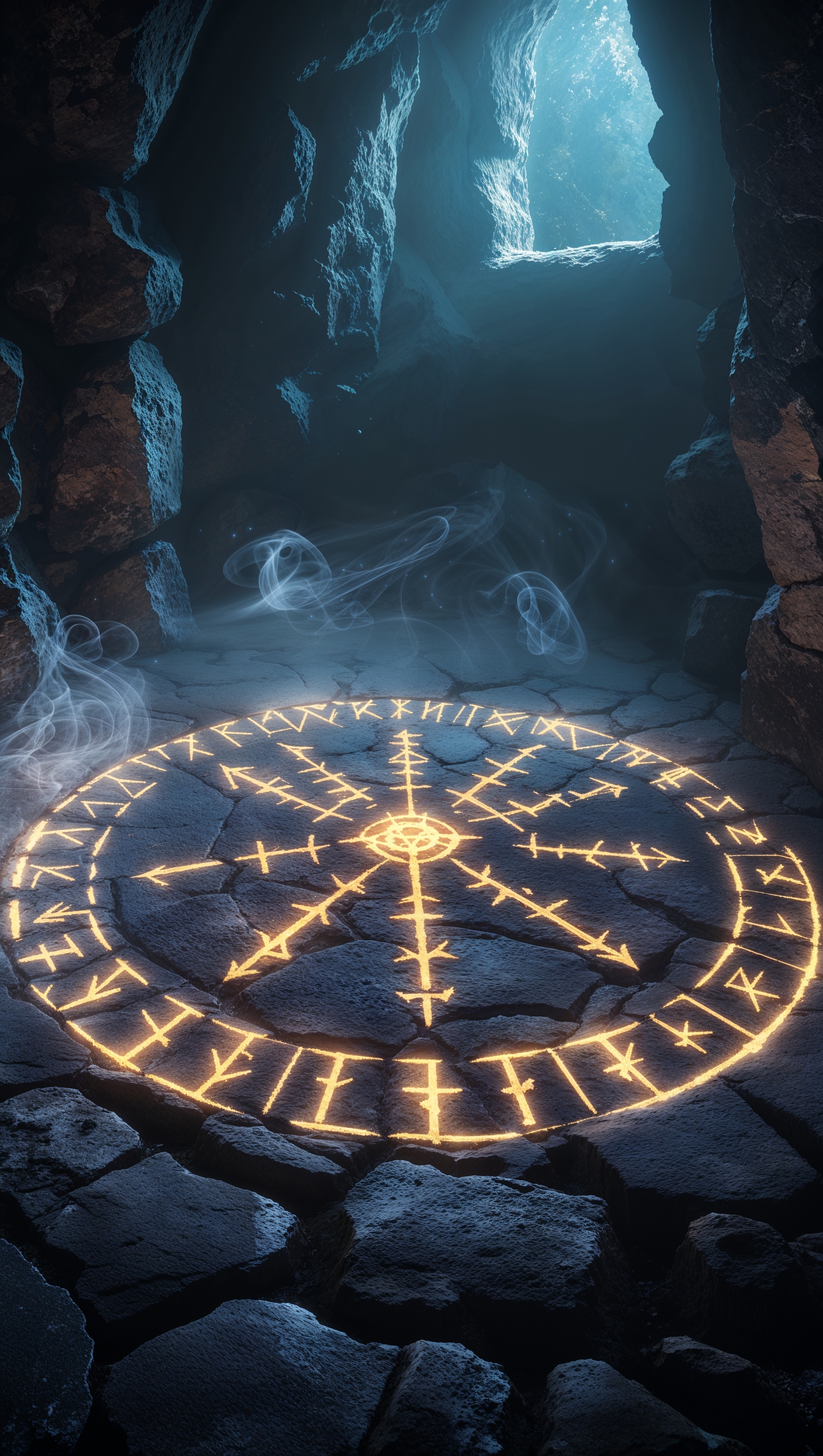 1664x2944 Mystical runes glowing on stone floor surrounded by shadows