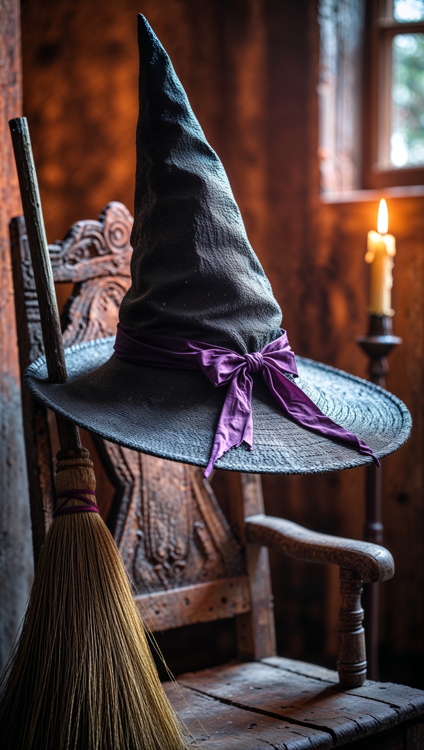 1664x2944 Witch’s hat and broom leaning on old wooden chair in candlelight