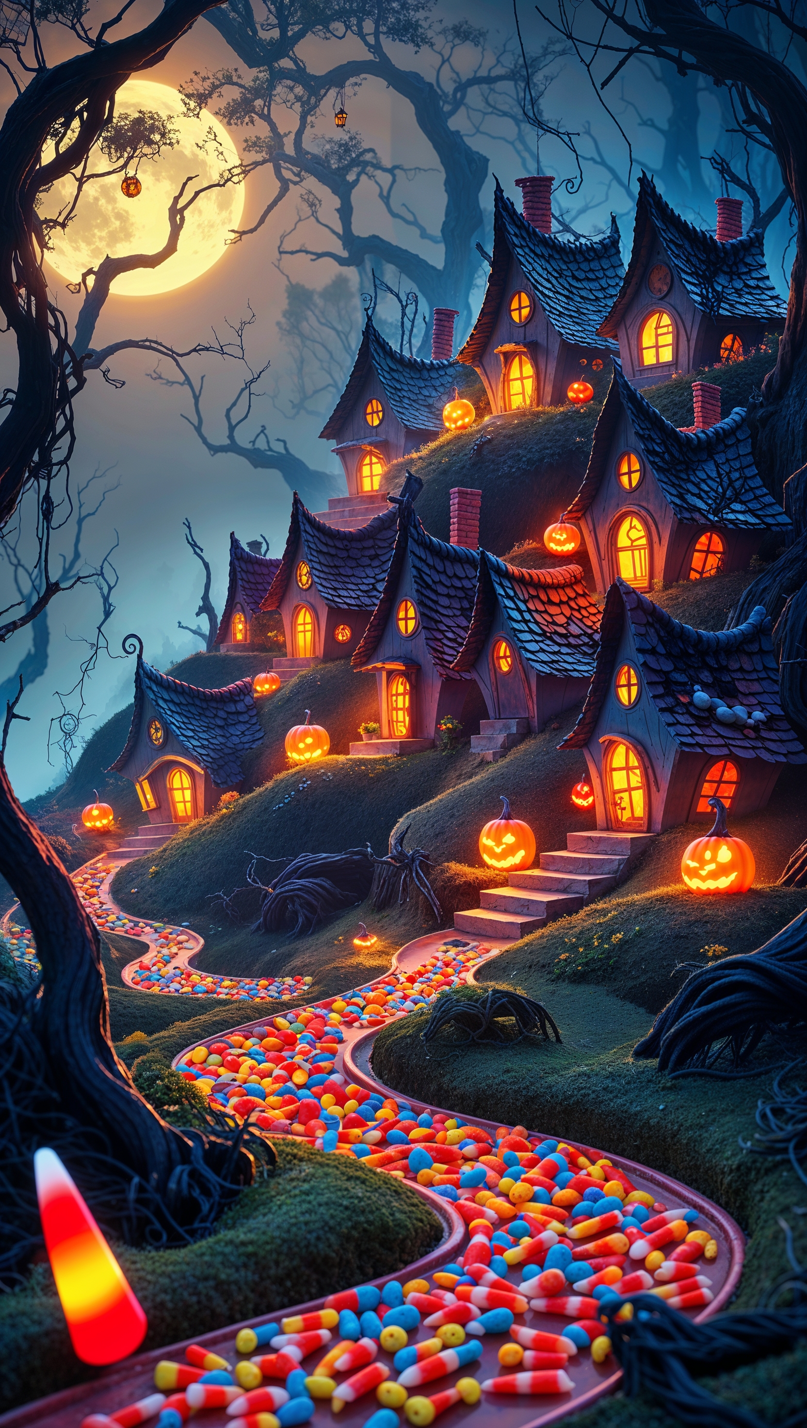 1664x2944 Vertical cartoon-style Halloween village with tiny houses and candy paths