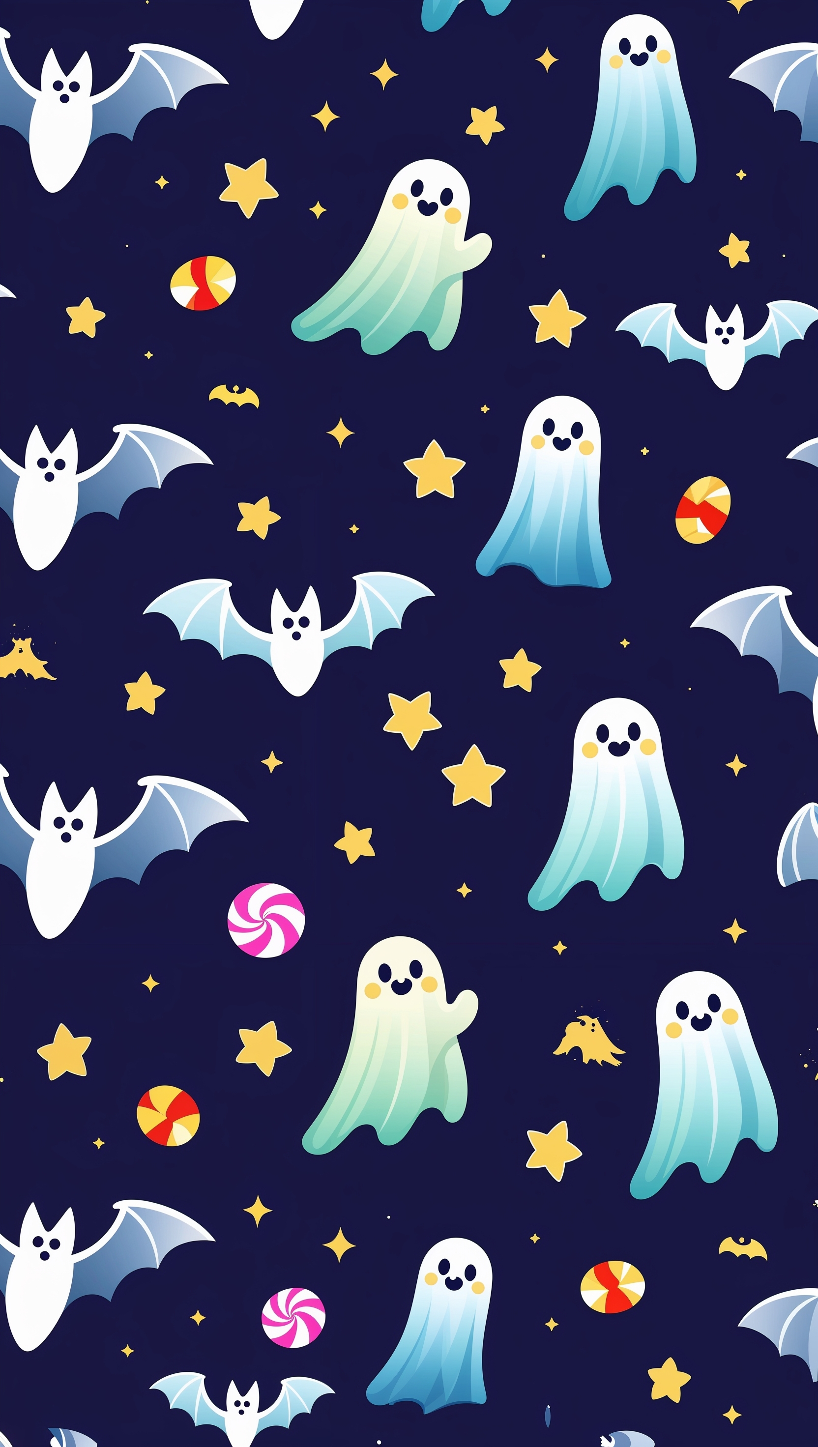 1664x2944 Flat vector Halloween wallpaper with bats, stars, ghosts, and candy icons