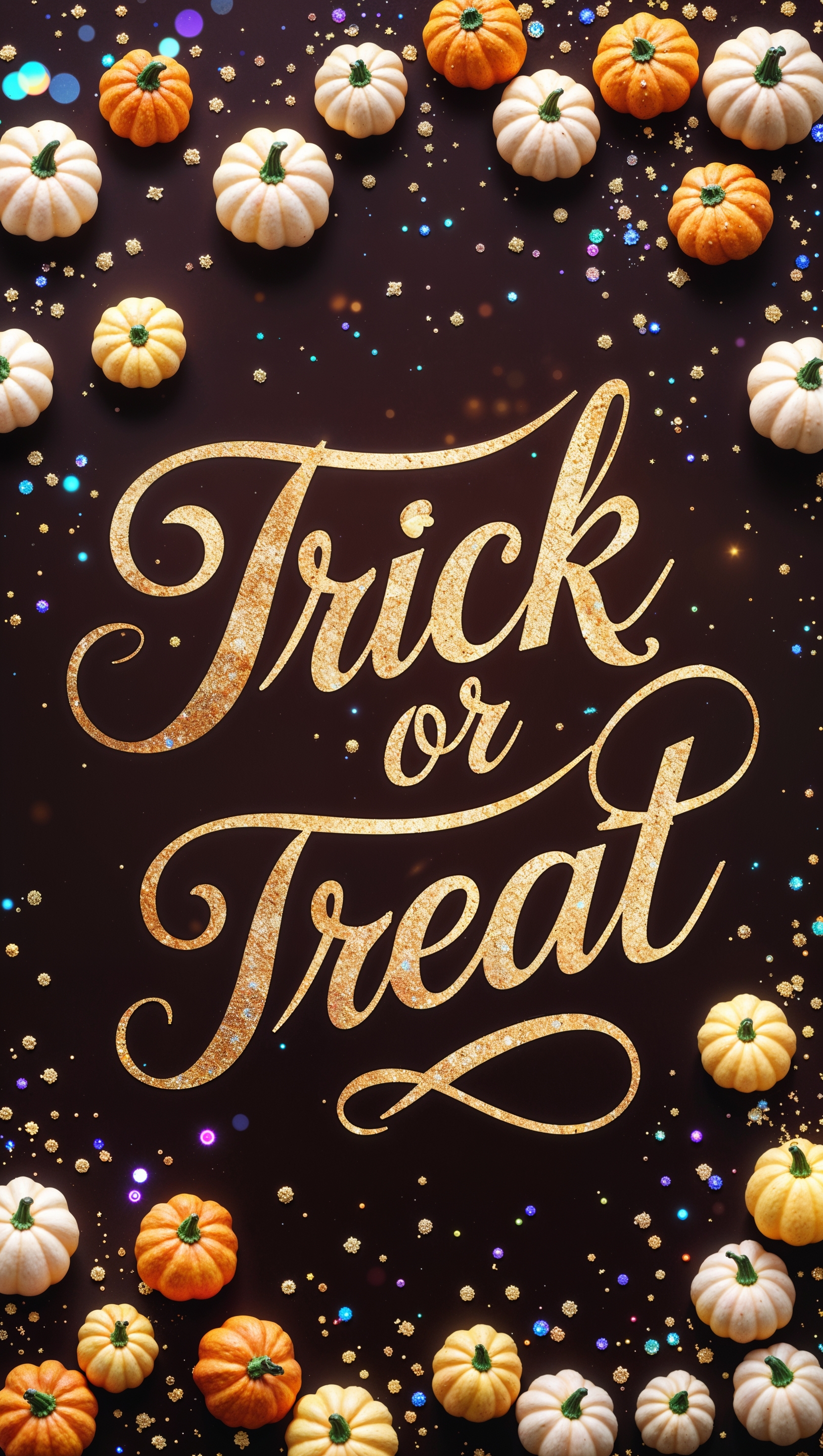 1664x2944 "Trick or Treat" in stylish script with tiny pumpkins and sparkles