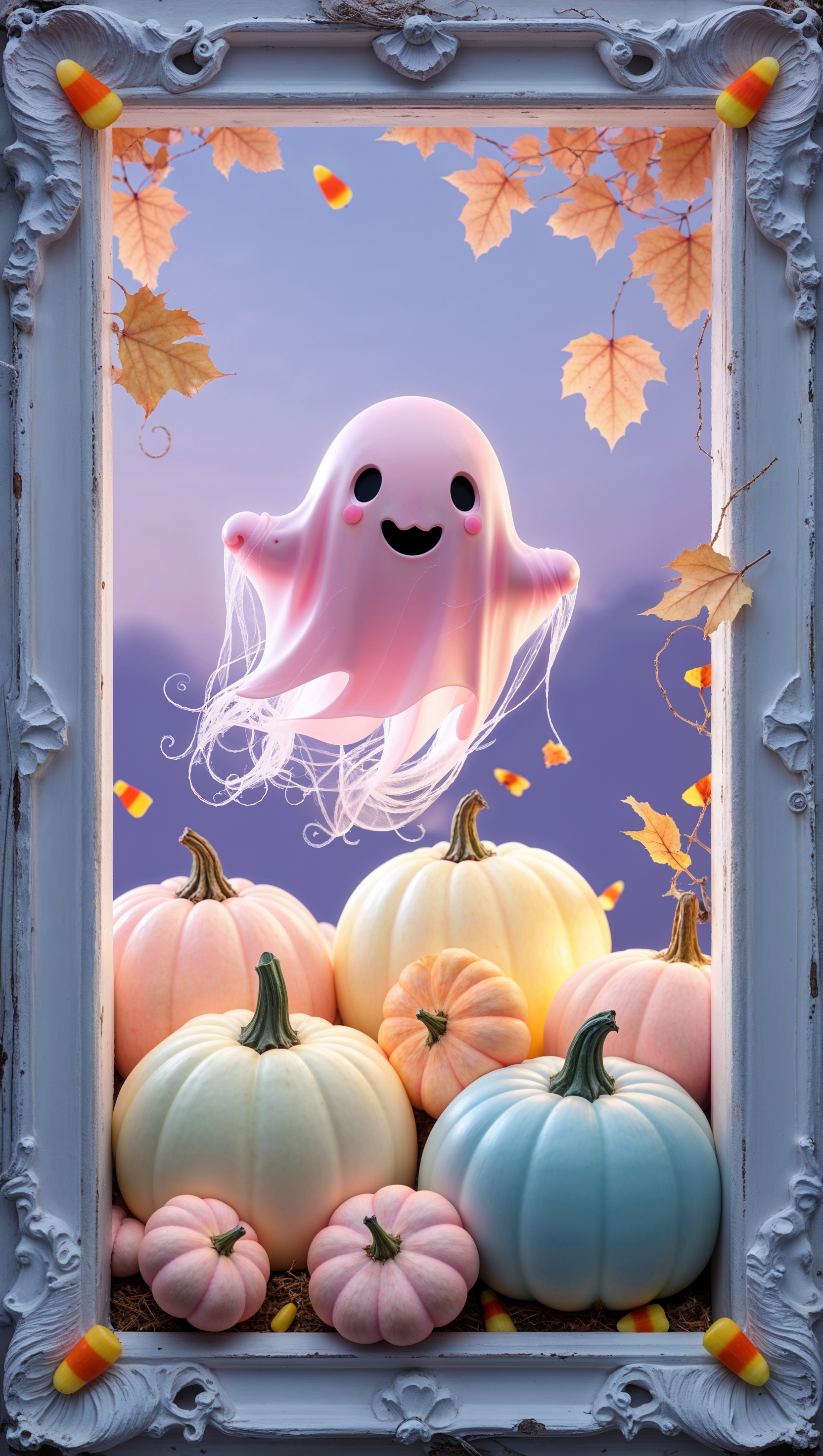 1664x2944 Pastel Halloween scene with pink ghost and soft pumpkins, cute aesthetic