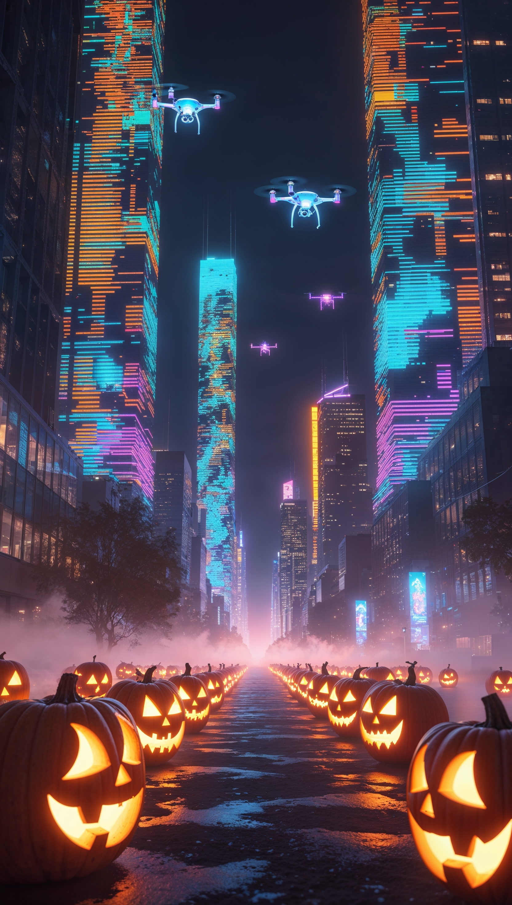 1664x2944 Cyberpunk Halloween night with neon pumpkins and glitchy buildings