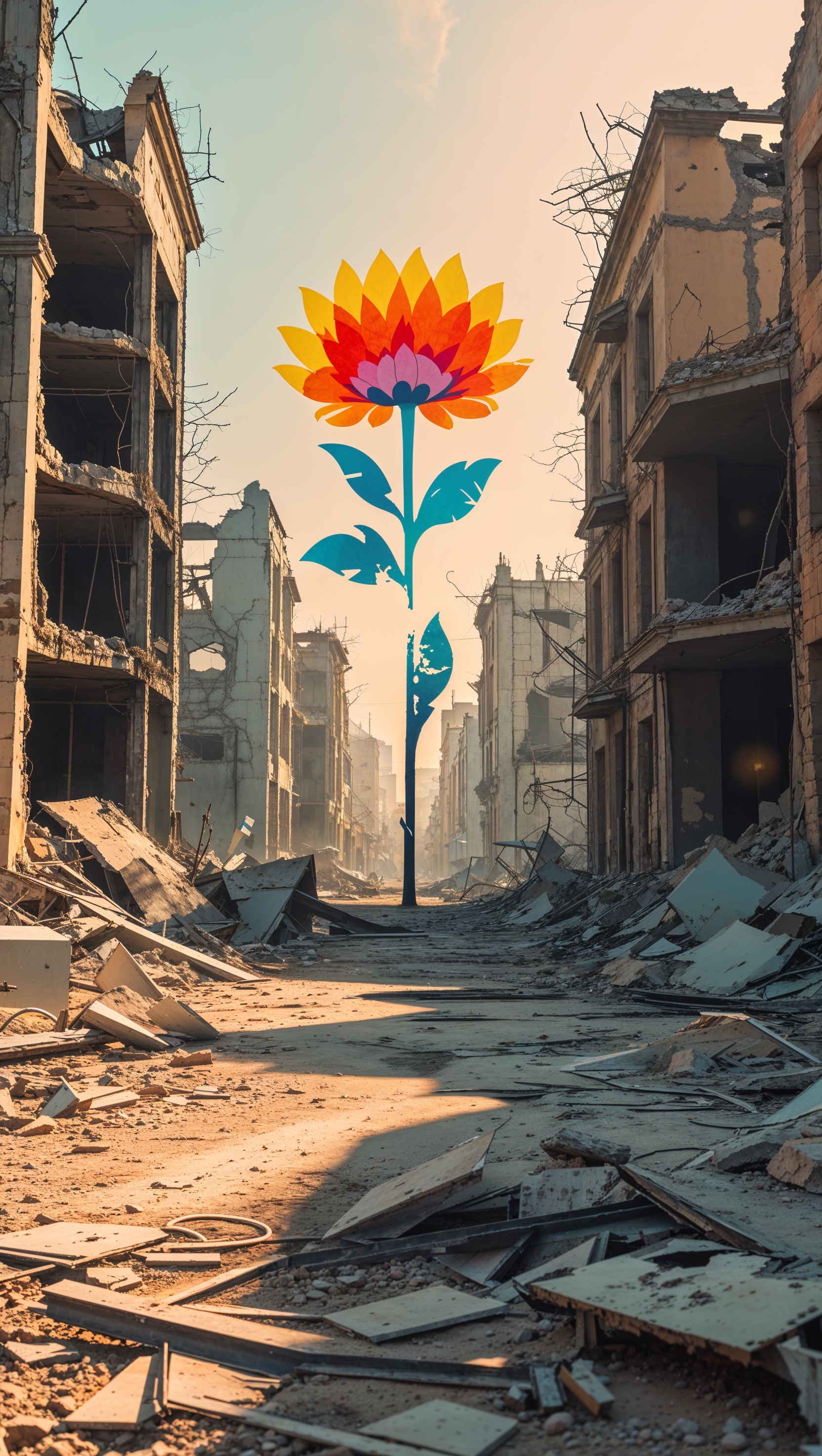 1664x2944 An image of a ruined city with a street painting of hope in Banksy style