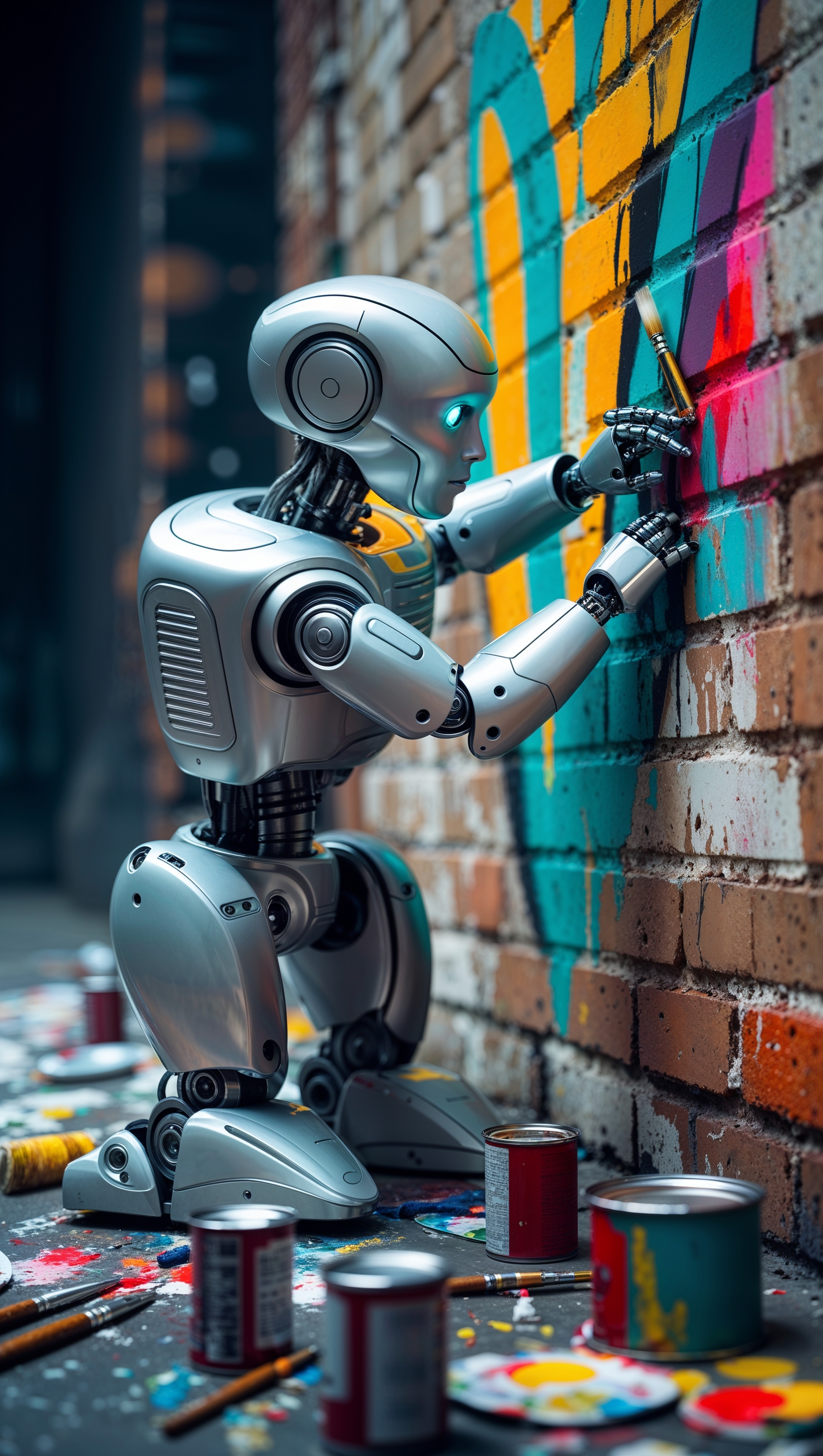 1664x2944 Street art of a robot painting on a wall, inspired by Banksy