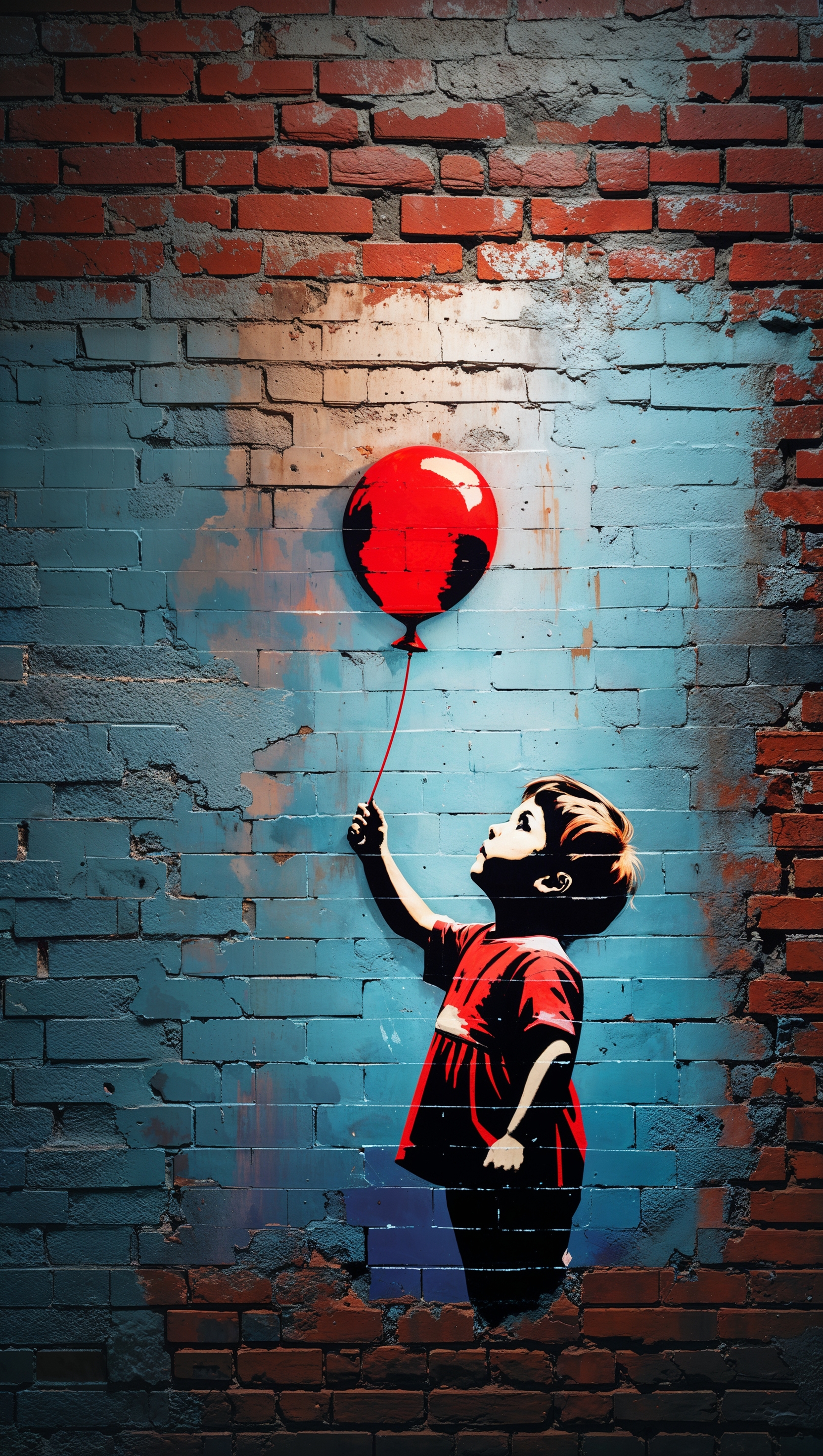 1664x2944 A brick wall with Banksy-style graffiti featuring a child with a red balloon