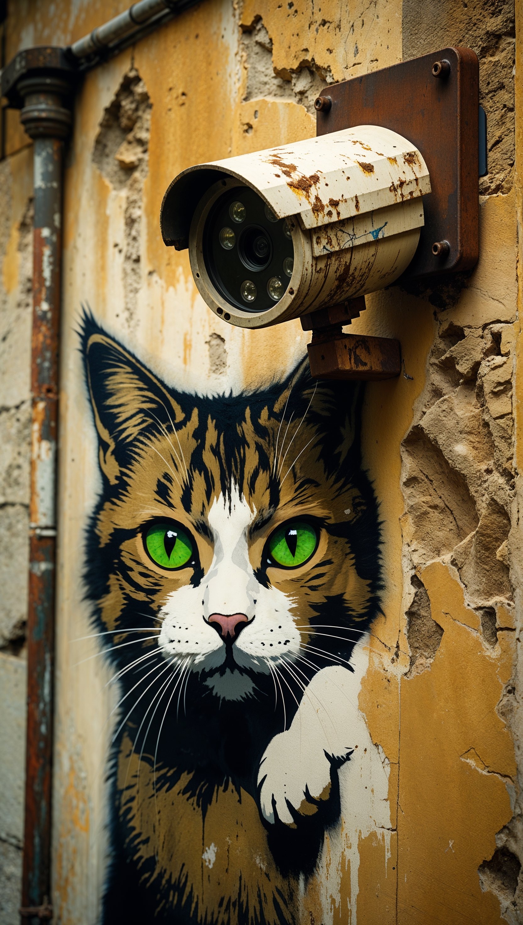 1664x2944 An old wall with a Banksy-style painting of a cat staring at a security camera