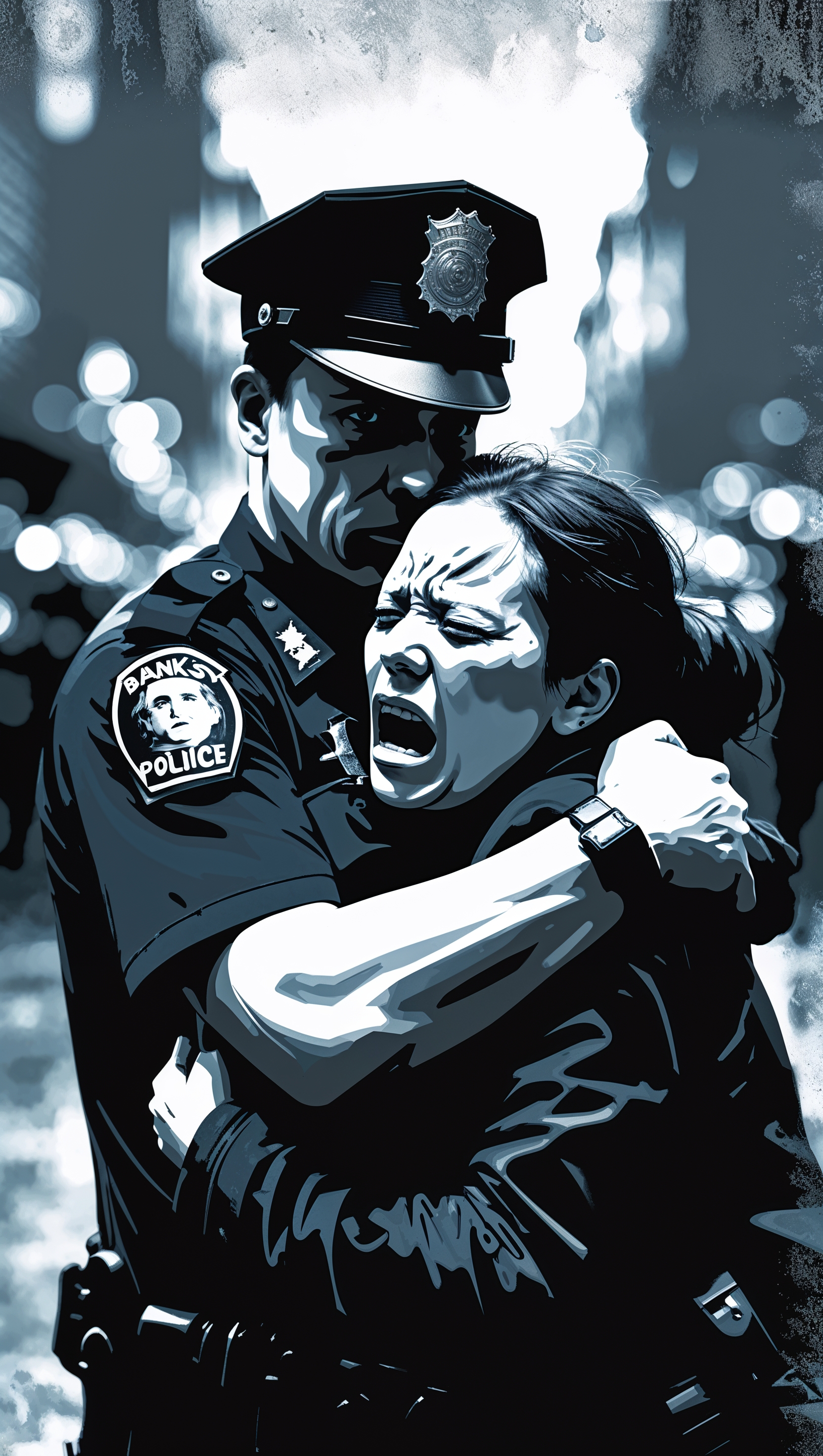 1664x2944 A black and white design of a police officer hugging a protester in Banksy style