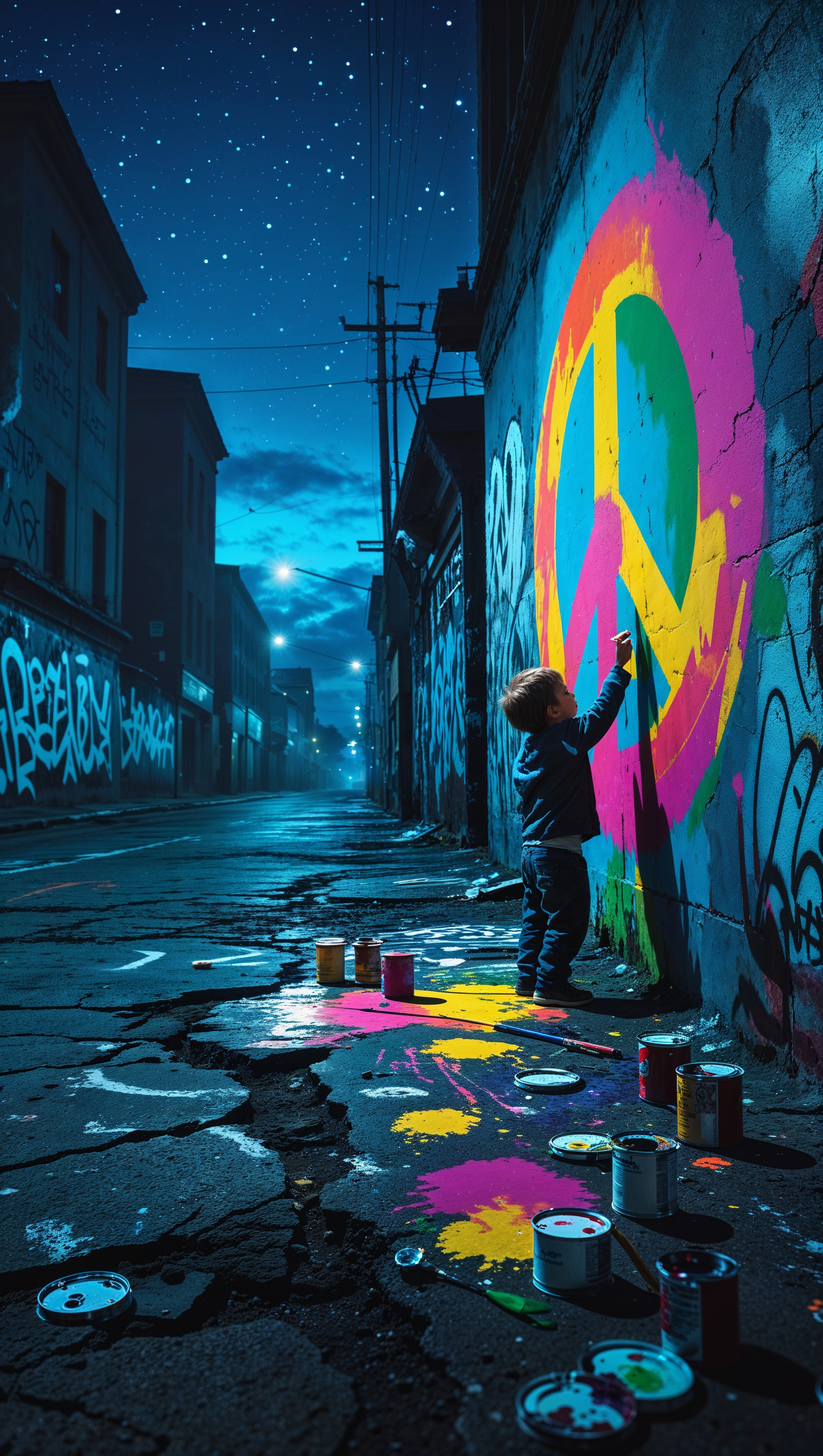 1664x2944 A dark street with graffiti of a child painting peace in Banksy style