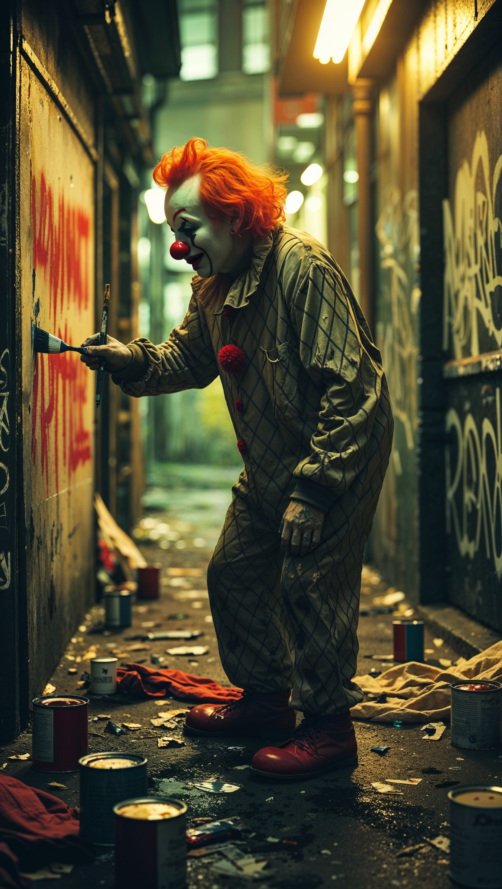 1664x2944 An image of a clown painting an anti-capitalist slogan in Banksy style
