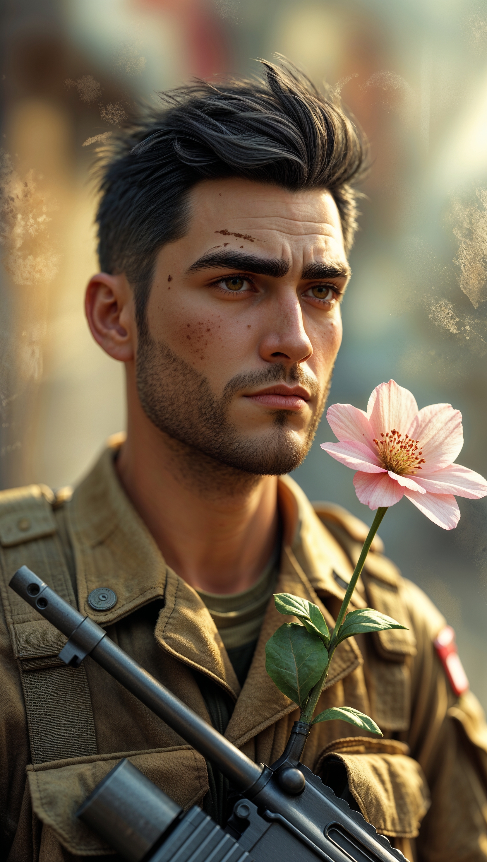 1664x2944 A design of a soldier carrying a flower instead of a gun, inspired by Banksy