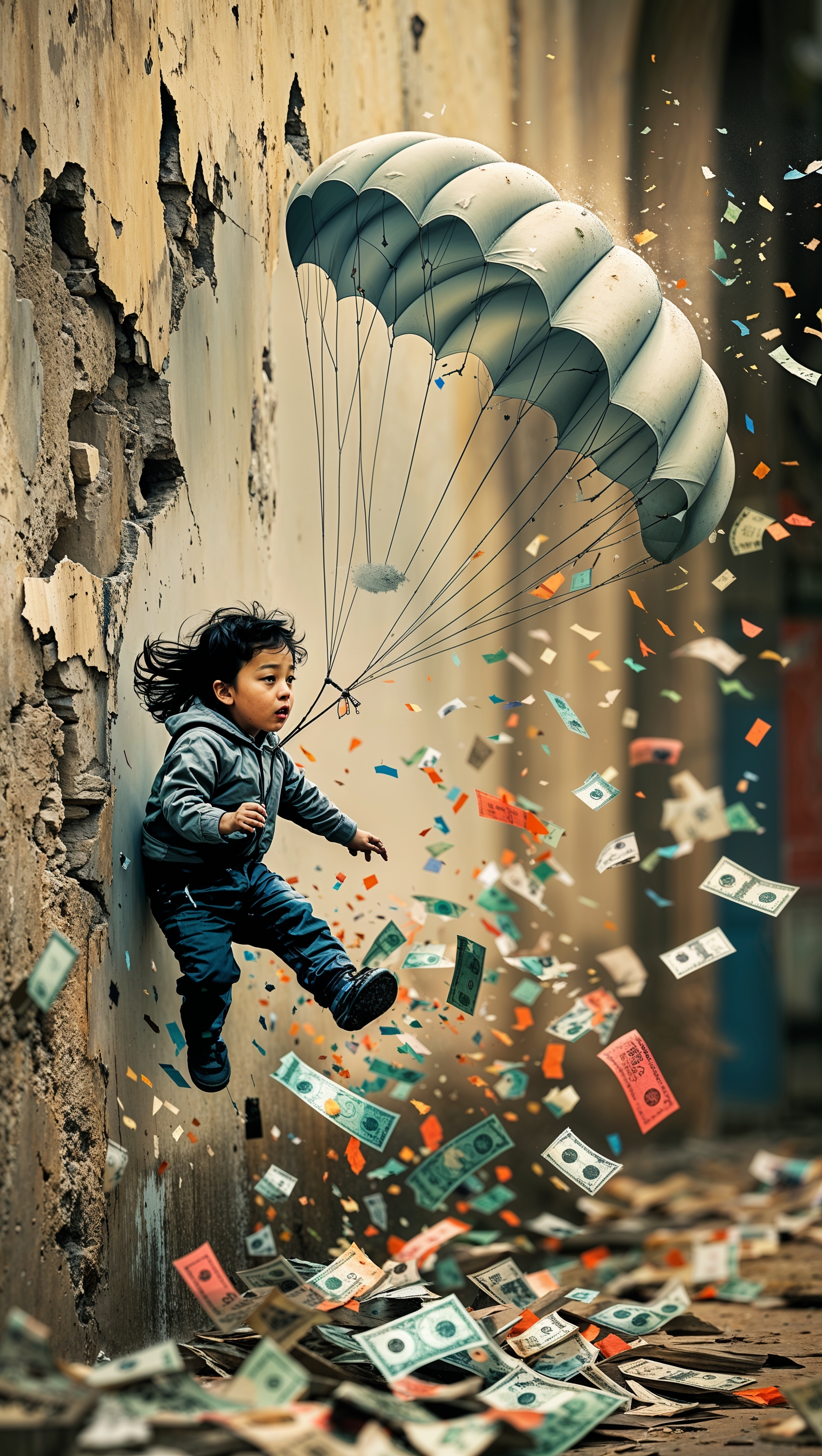 1664x2944 An abandoned wall with Banksy-style art of a child parachuting with money