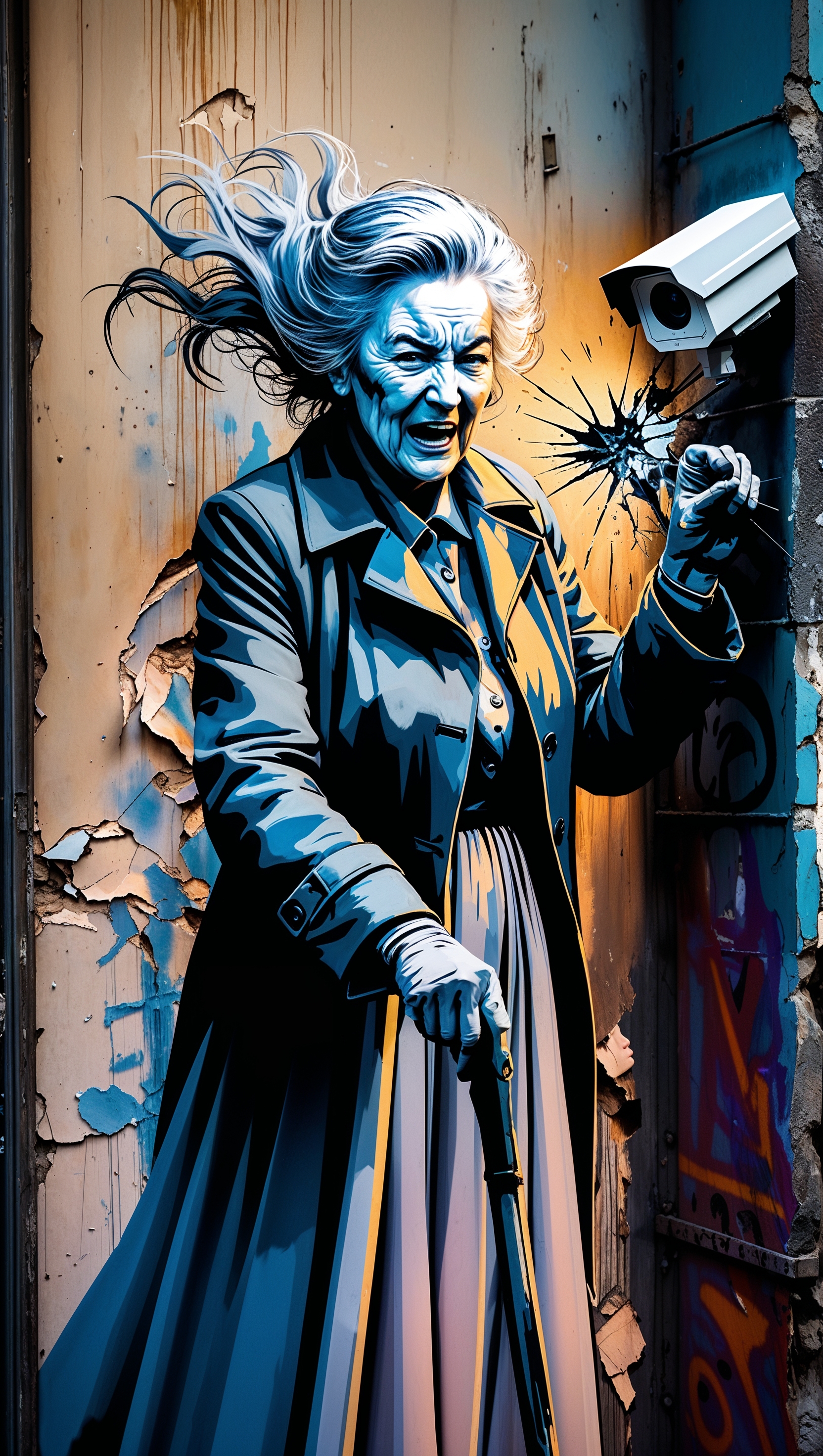 1664x2944 A wall with a Banksy-style design of an old lady breaking a security camera