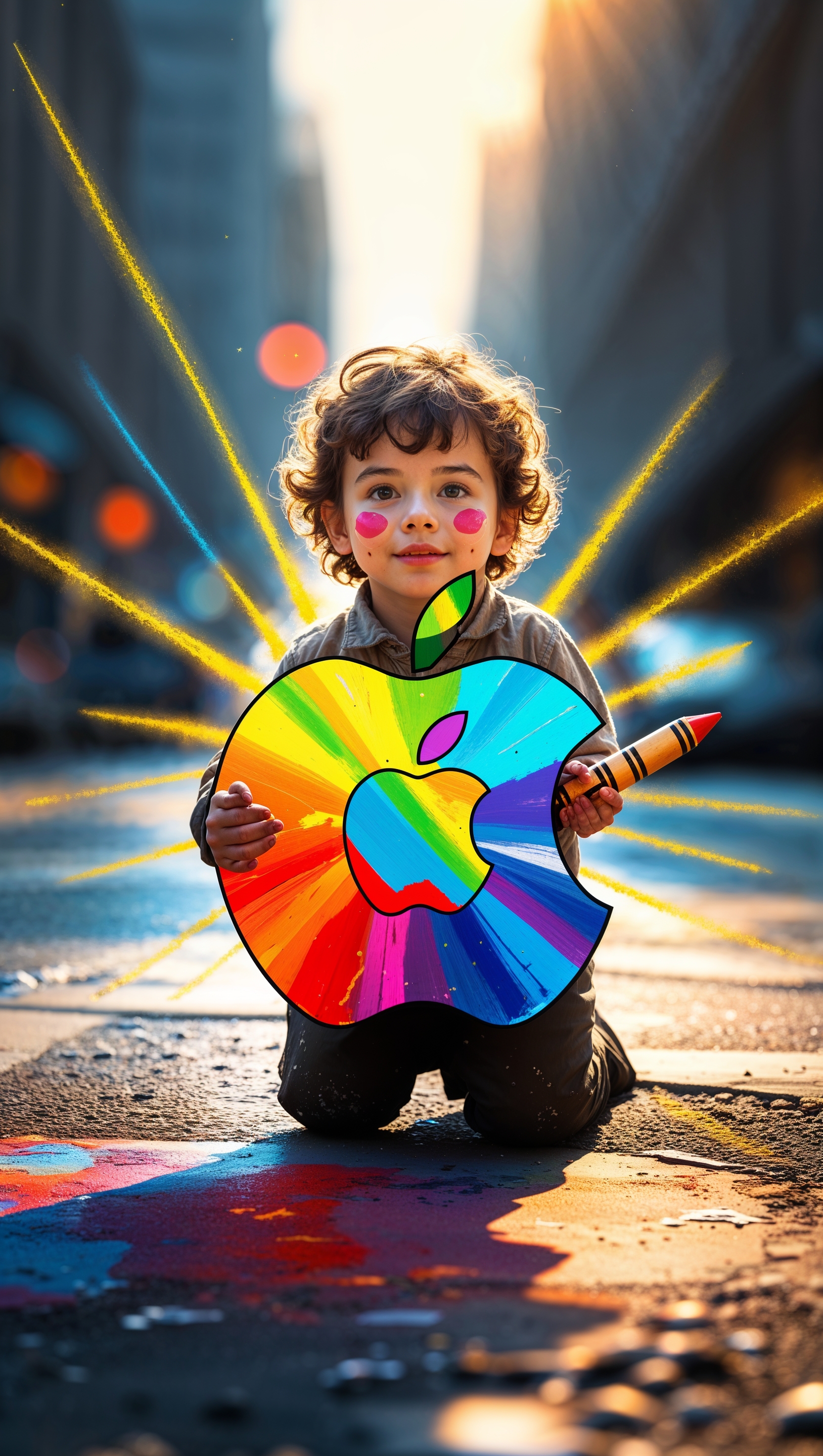 1664x2944 Street painting of a child drawing the Apple logo as the sun
