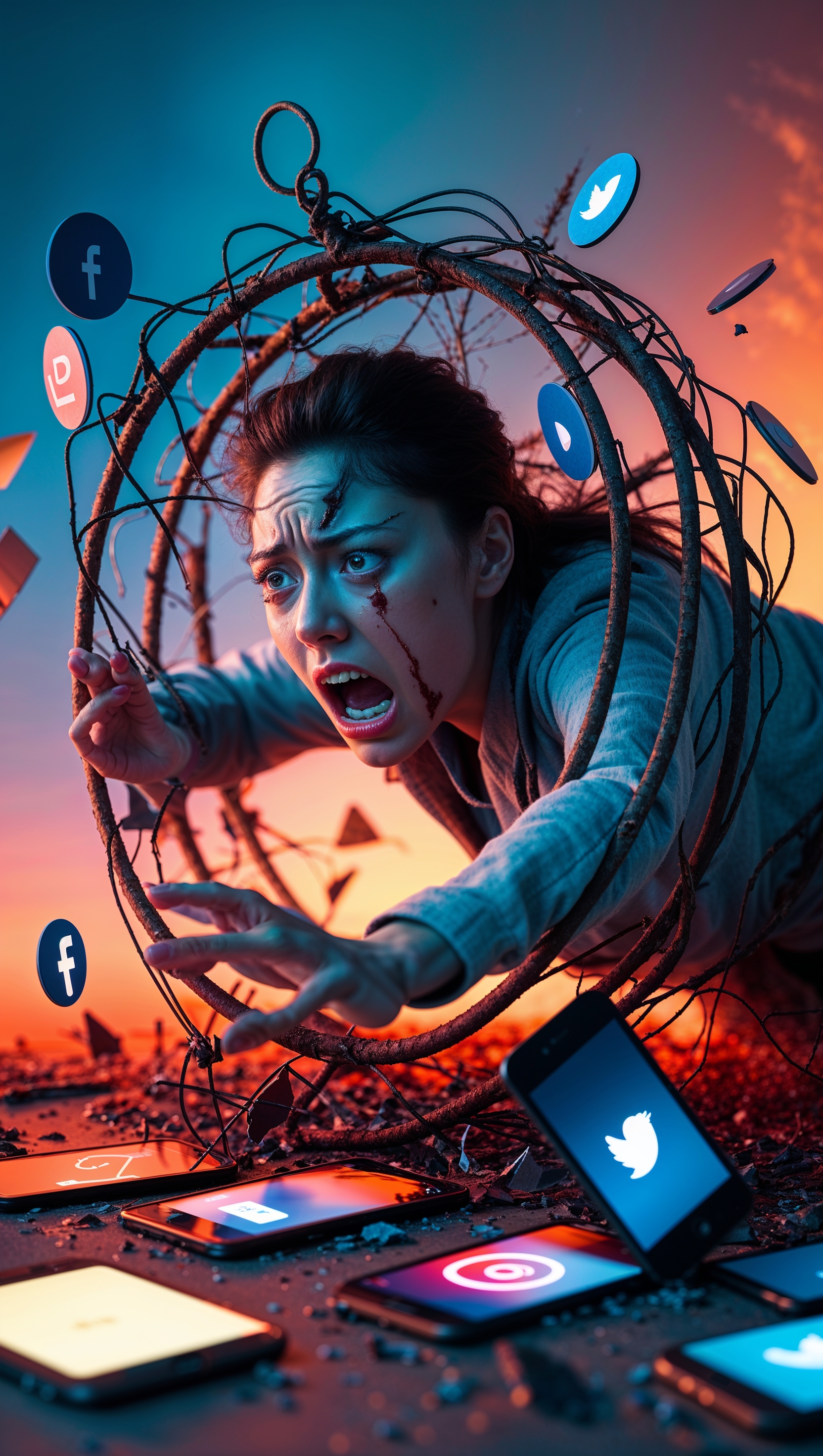 1664x2944 Graffiti of a person trying to escape the cage of social media