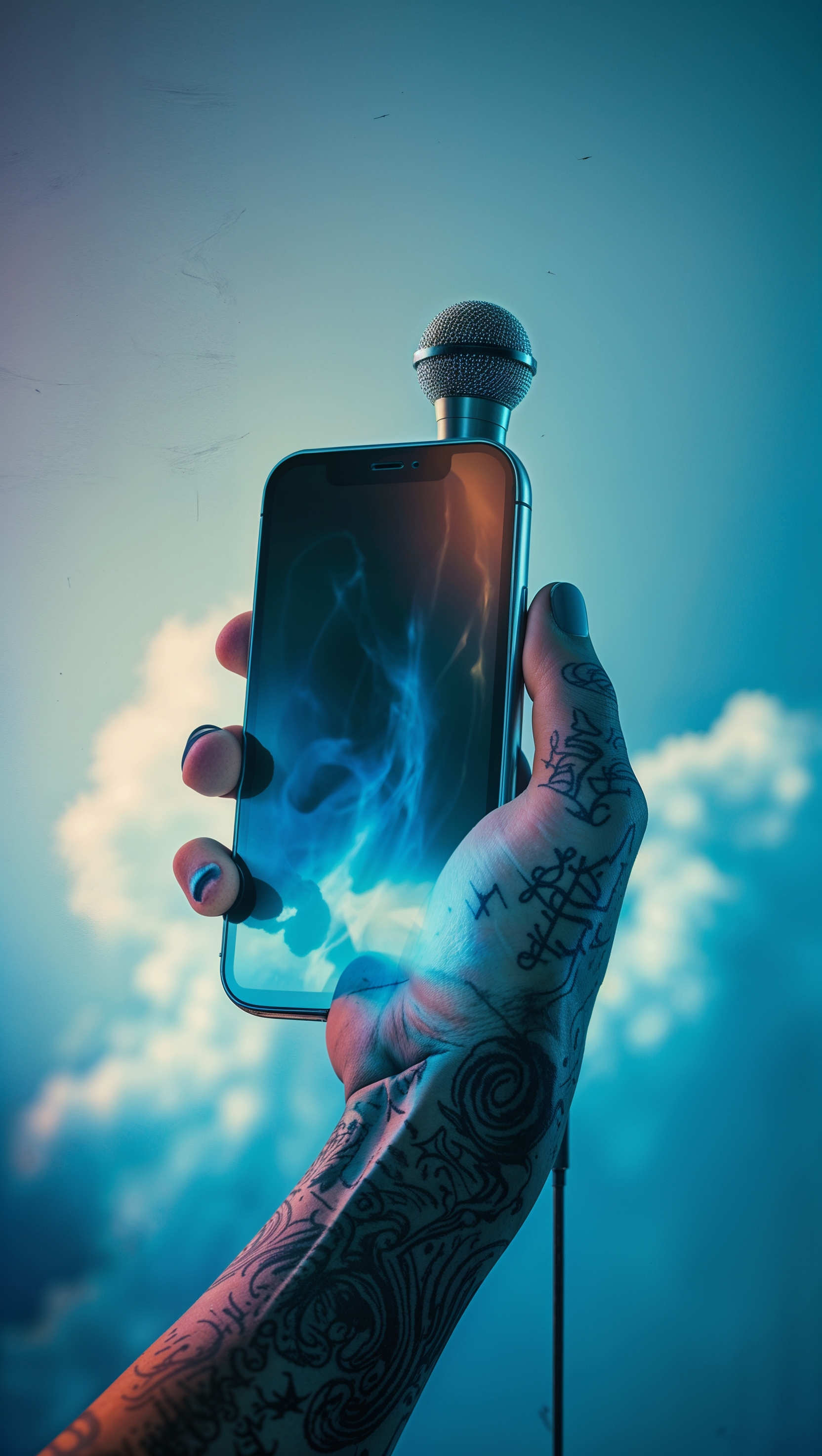1664x2944 An image of a hand holding an iPhone like a microphone, in Banksy style