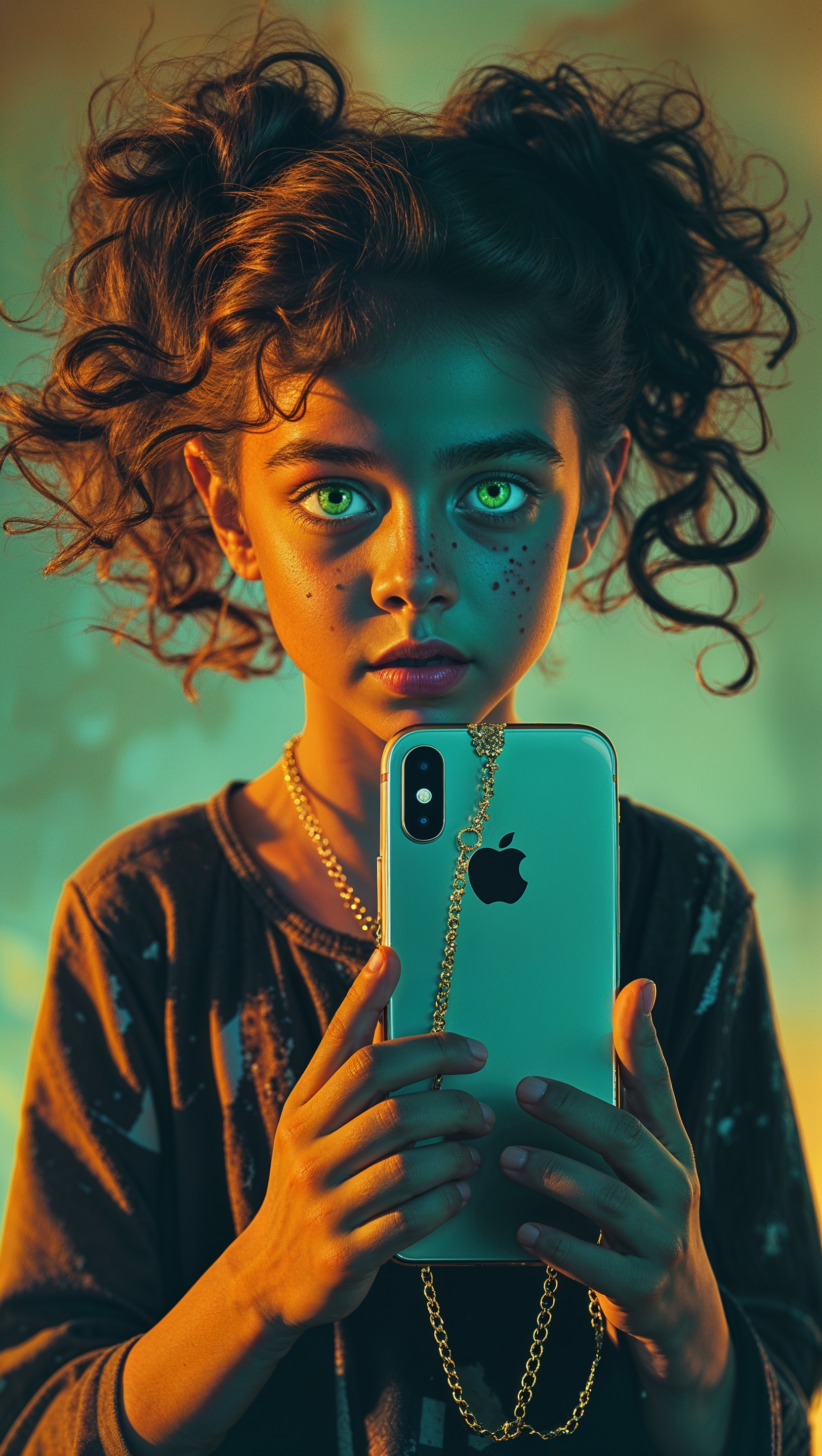 1664x2944 An image of a girl holding an iPhone like a chain, in Banksy style