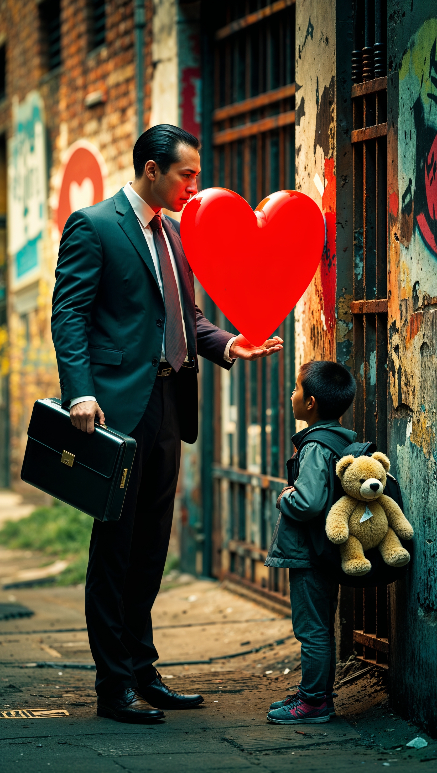 1664x2944 A design of a businessman buying a red heart from a street child, Banksy style