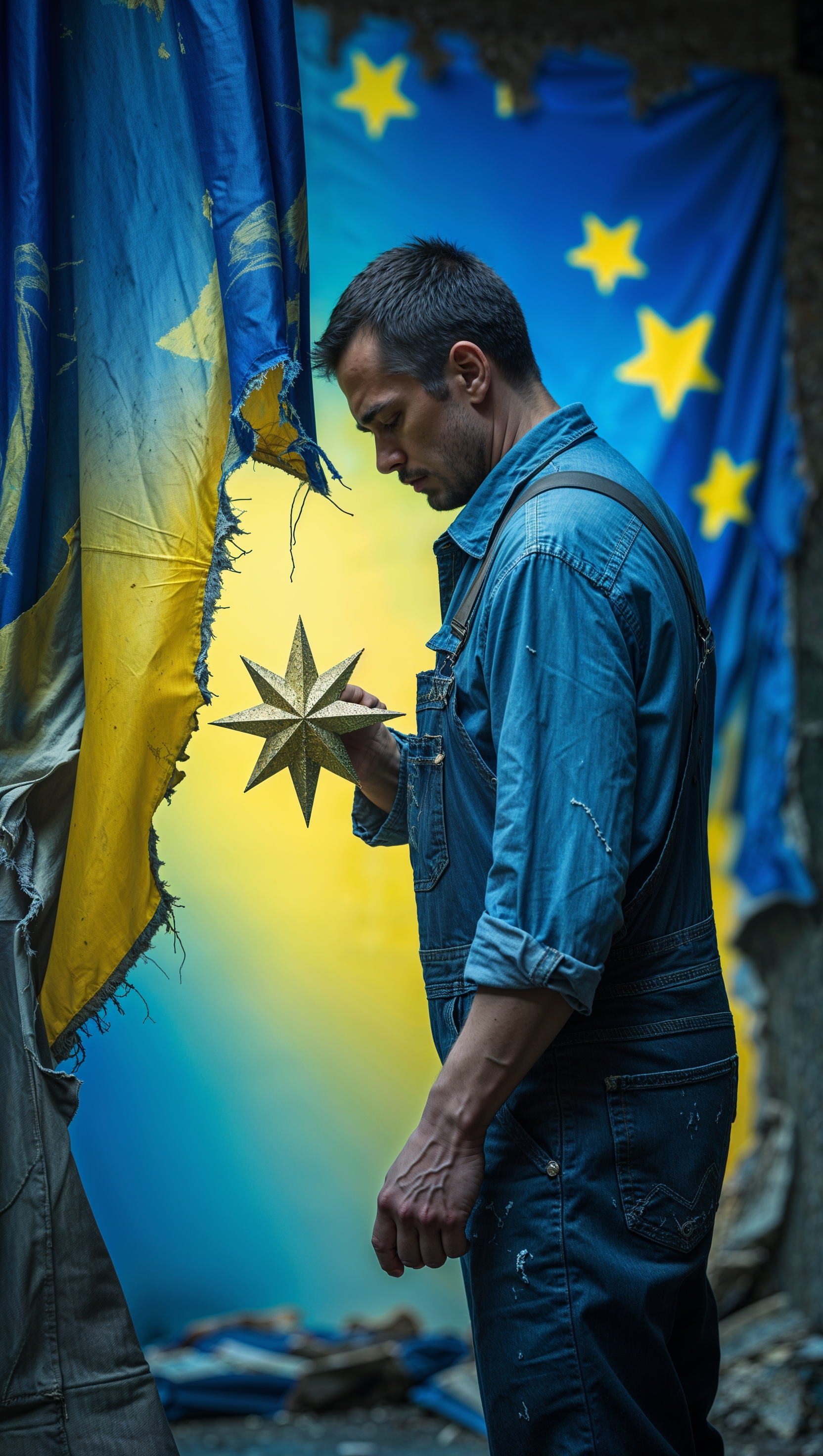 1664x2944 A design of a worker removing a star from the EU flag, Banksy-style