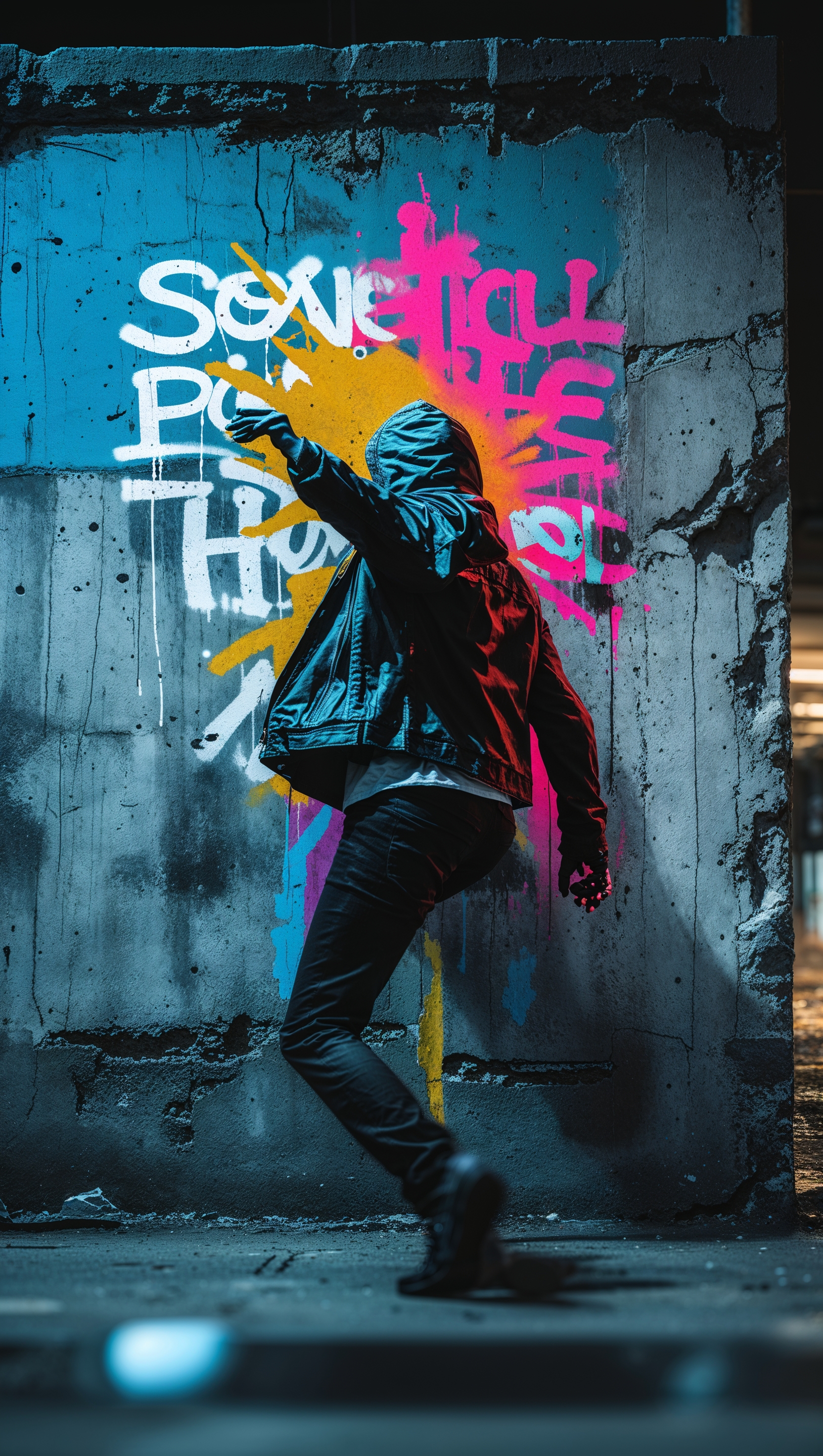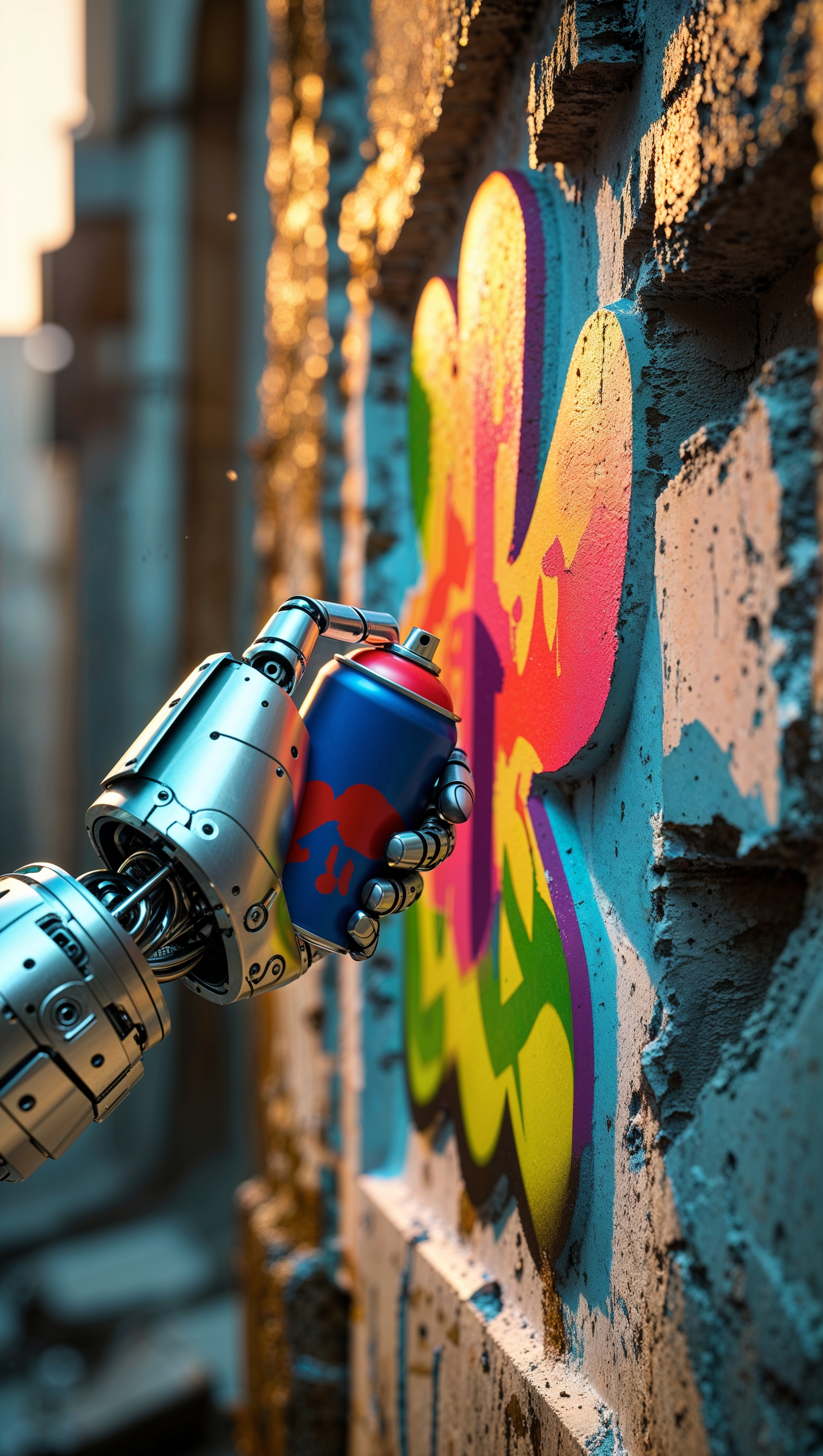 1664x2944 A city wall with a robotic hand painting graffiti, Banksy style