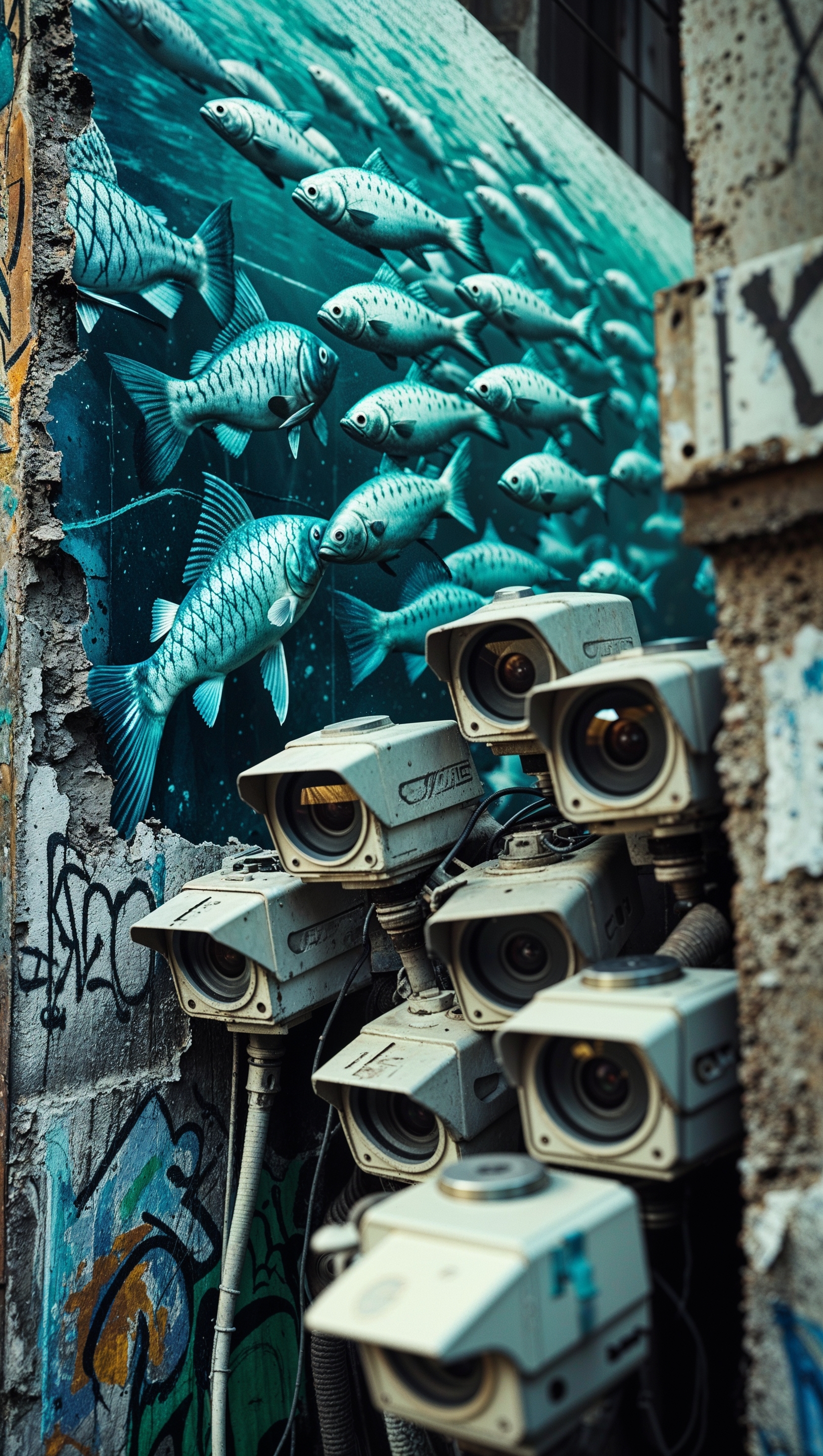 1664x2944 A city wall with a painting of CCTV cameras monitoring fish
